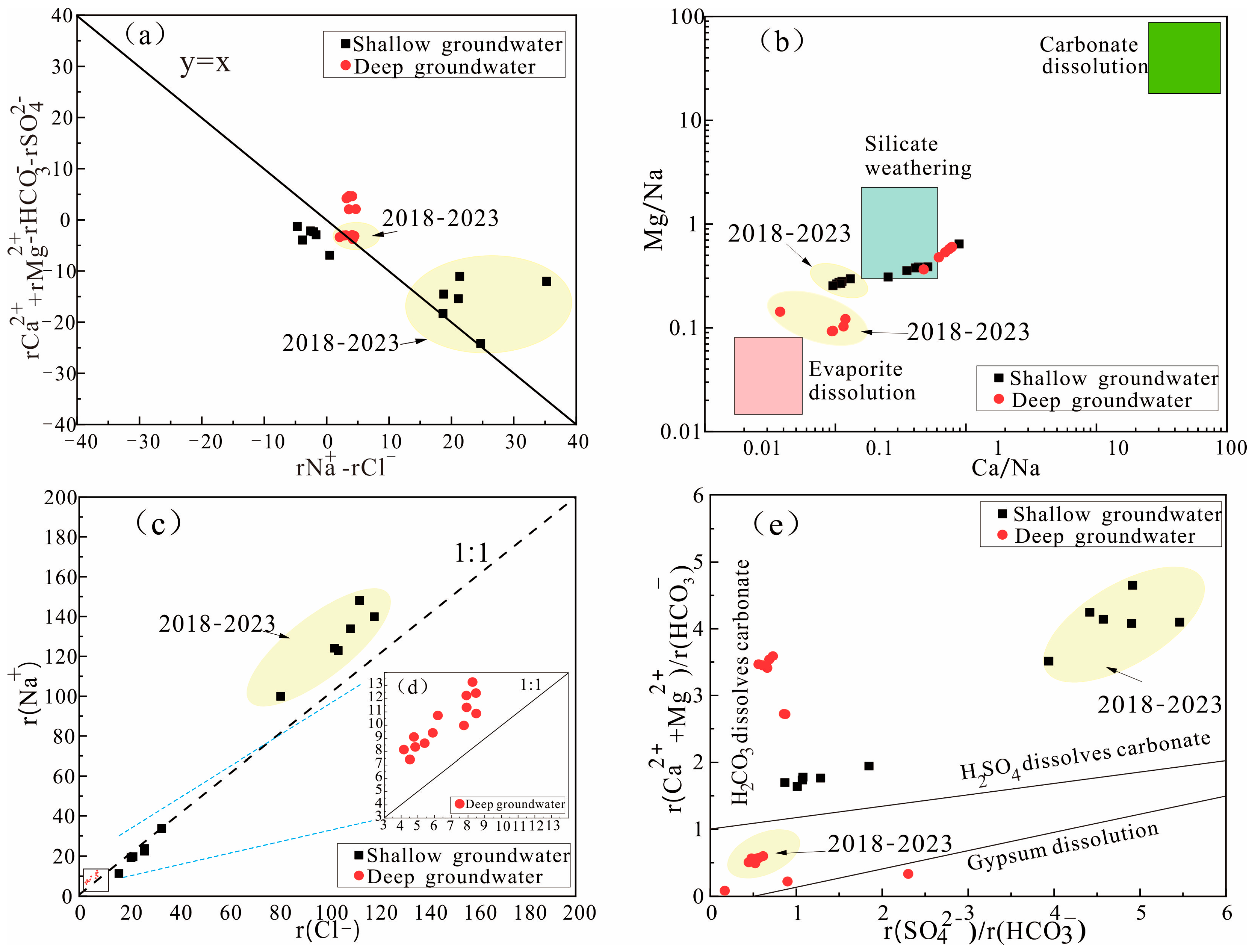 Based on the Na+/Cl ratio diagram, the sources of Na+ and Cl can be inferred [40]. Prior to the implementation of GWER, the data points for SG were located on the 1:1 line. After the implementation of GWER, the points shifted above the 1:1 line, indicating that the sources of Na+ were not halite dissolution, but cation exchange (Figure 7a). The points for DG do not lie on the 1:1 line, suggesting that Na+ in DG is not solely derived from salt rock dissolution (Figure 7c,d) but also has other sources, such as cation exchange (Figure 7a).