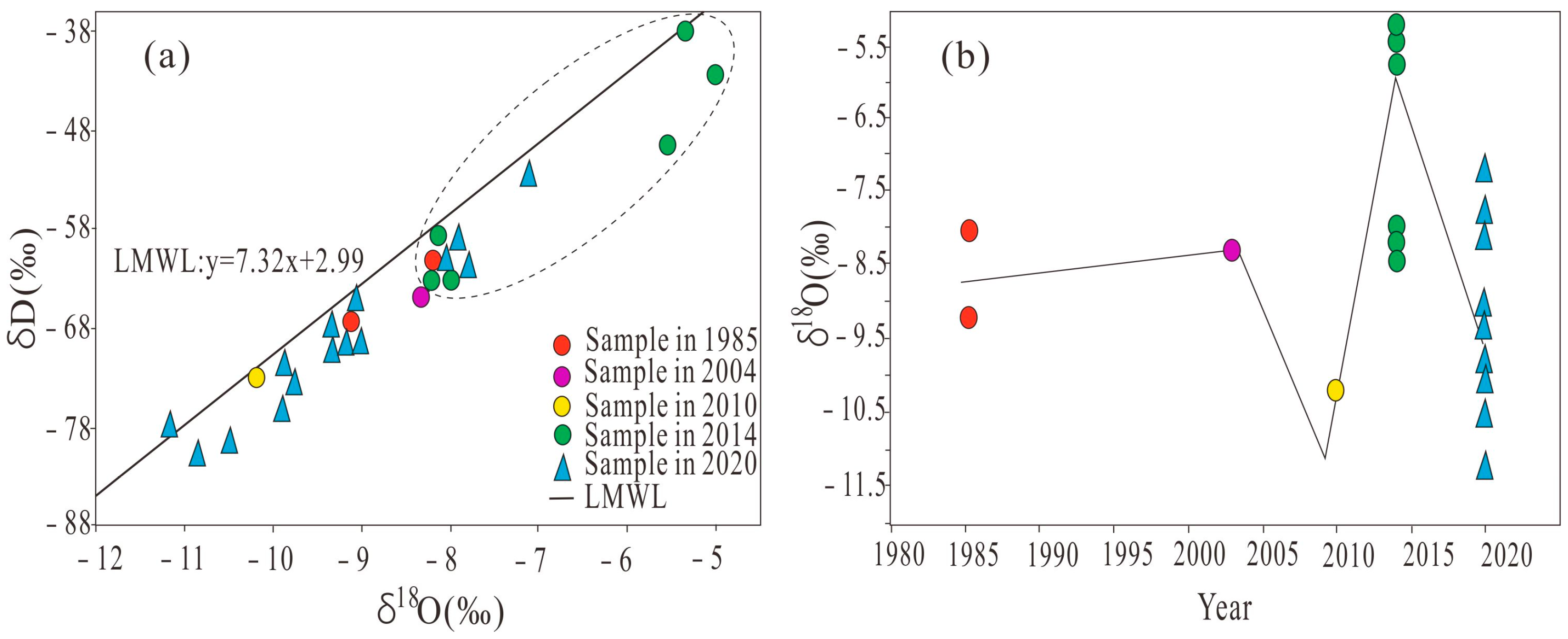 Figure 10. Temporal variation in δ18O in SG. (a) Distribution of δD and δ18O; (b) annual variation in δ18O. The dashed ovals in figure (a) represent of the sample in 2014.