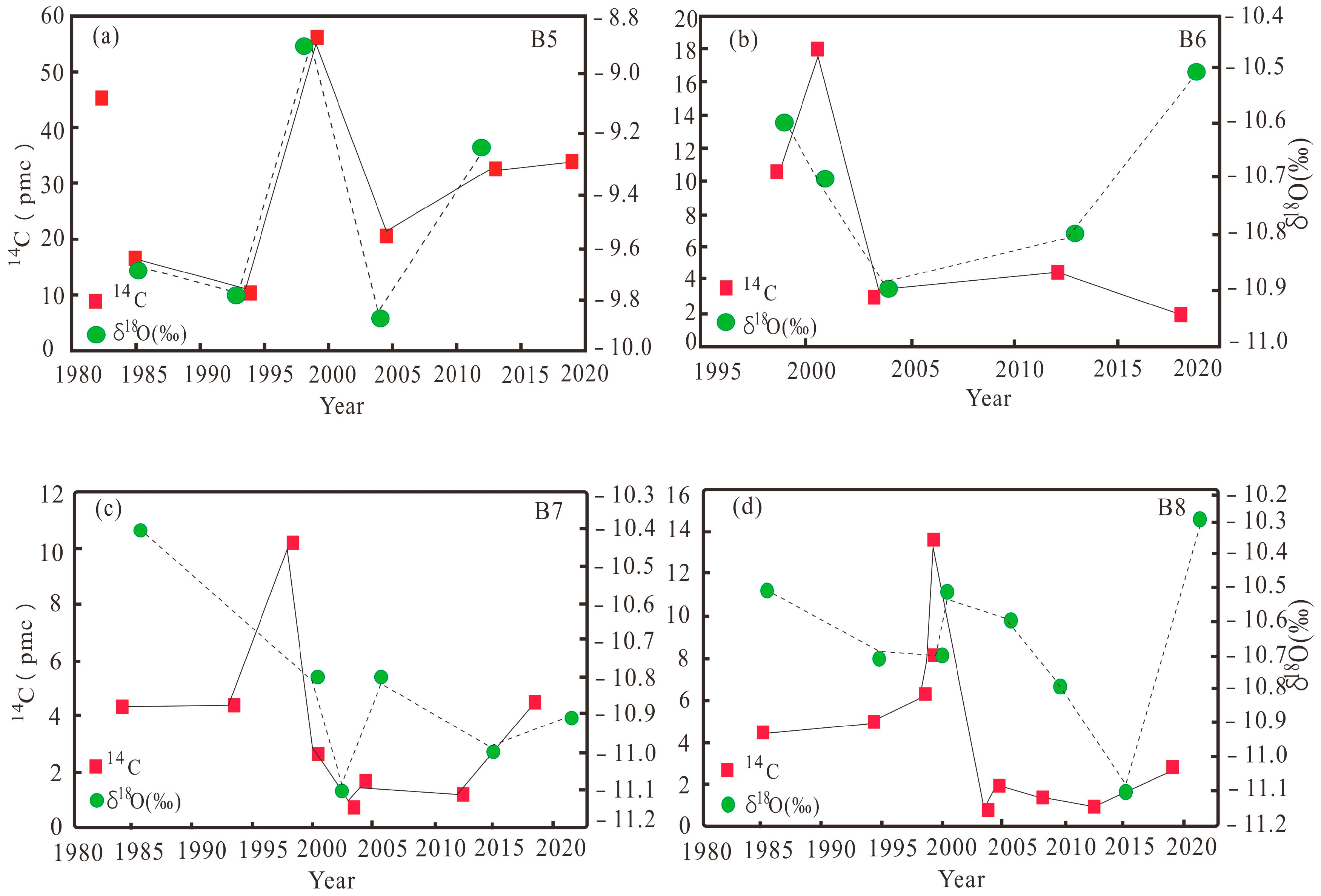 Figure 11. Annual variation in 14C content and isotopes in DG. (a)The annual variation in 14C content and isotopes in sample point B5. (b)The annual variation in 14C content and isotopes in sample point B6. (c)The annual variation in 14C content and isotopes in sample point B7. (d)The annual variation in 14C content and isotopes in sample point B8. The dashed and solid lines represent of δ18O and 14C content, respectively.