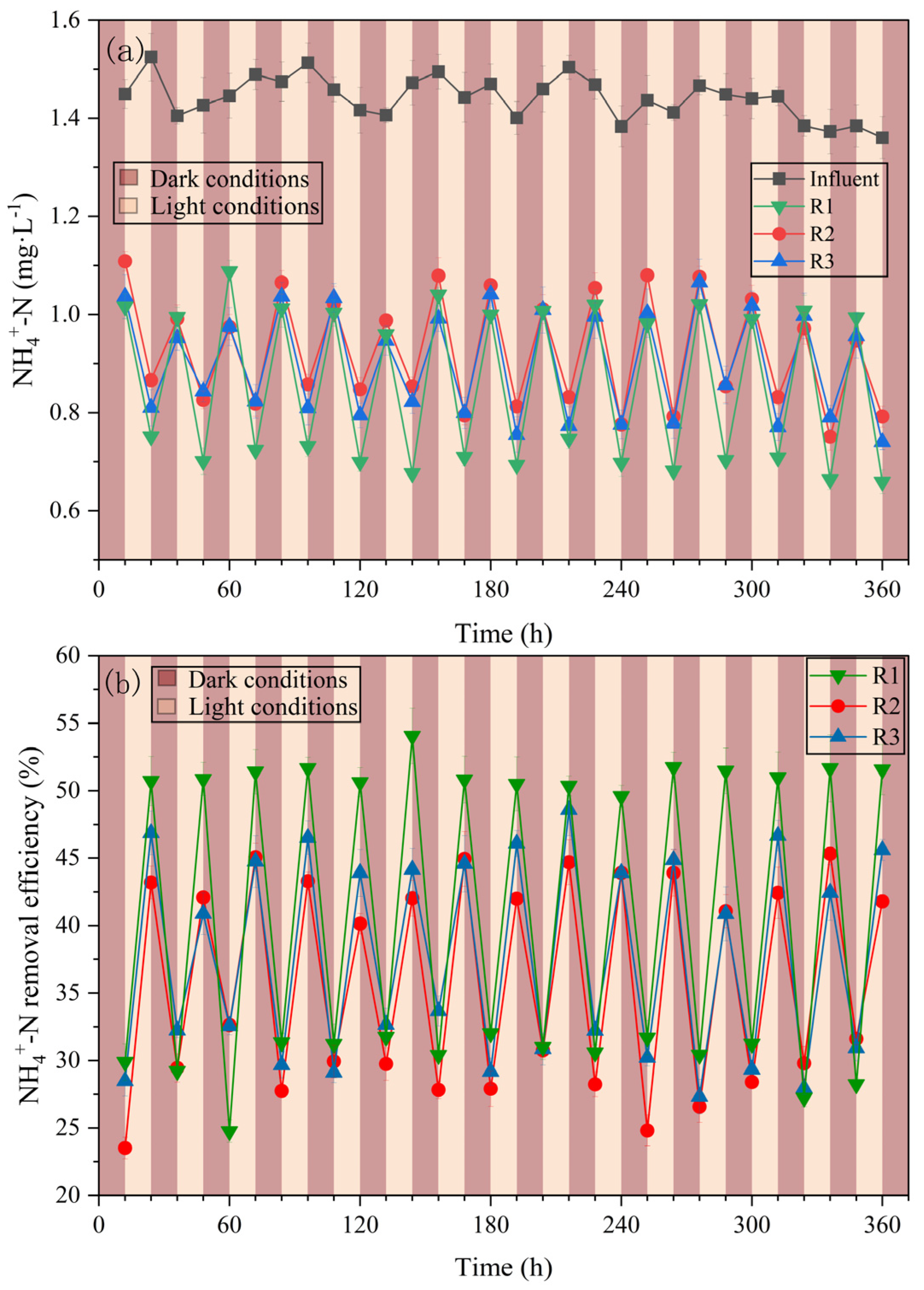 - Arun, S.; Manikandan, N.A.; Pakshirajan, K.; Pugazhenthi, G. Novel Shortcut Biological Nitrogen Removal Method Using an Algae-Bacterial Consortium in a Photo-Sequencing Batch Reactor: Process Optimization and Kinetic Modelling. J. Environ. Manag. 2019, 250, 109401. [Google Scholar] [CrossRef]