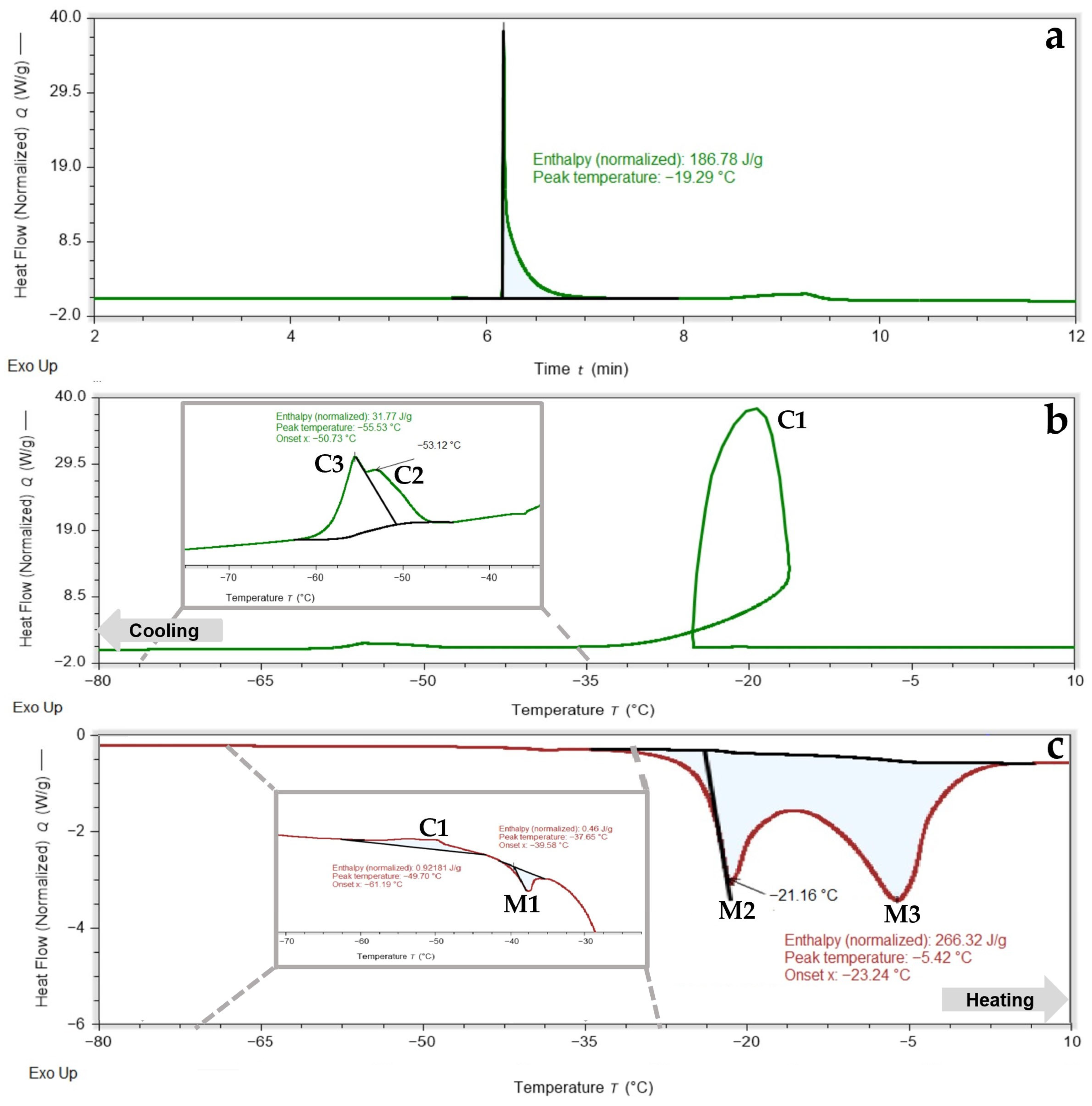 Samples were cooled from +20 °C to −50 °C at 1 °C·min−1 using controlled nitrogen vapor flow. After a 1 min isothermal hold at −50 °C, active cooling was discontinued, and samples were allowed to passively rewarm to room temperature over approximately 20 min.