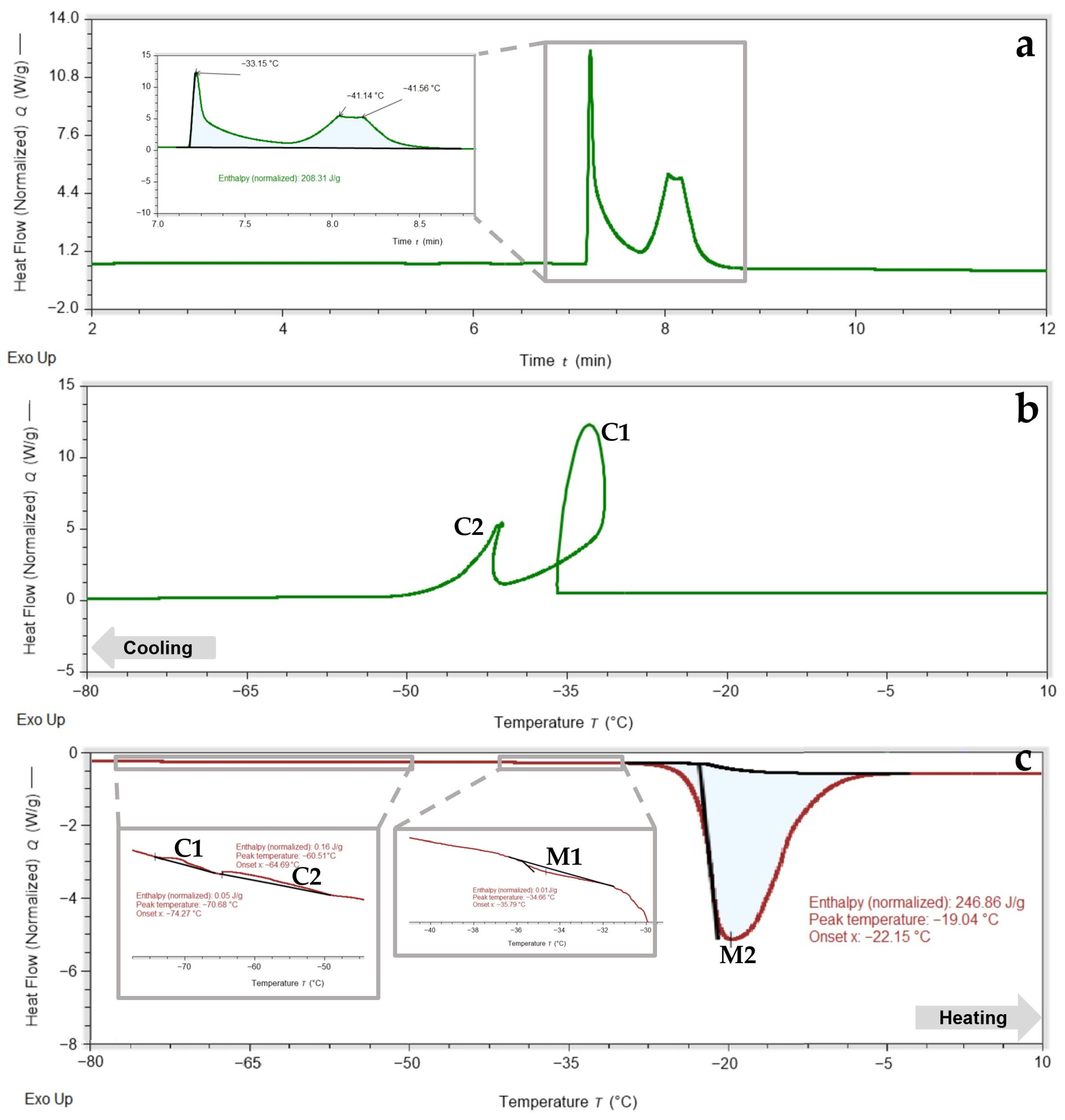 Samples were cooled from room temperature to the target subzero temperature at controlled rates and subsequently heated at either 5 °C·min−1 or 10 °C·min−1, depending on the experimental series. The use of two heating rates allowed assessment of kinetic effects on phase transitions and potential recrystallization phenomena during warming. All measurements were performed under a dry nitrogen purge (50 mL·min−1).
