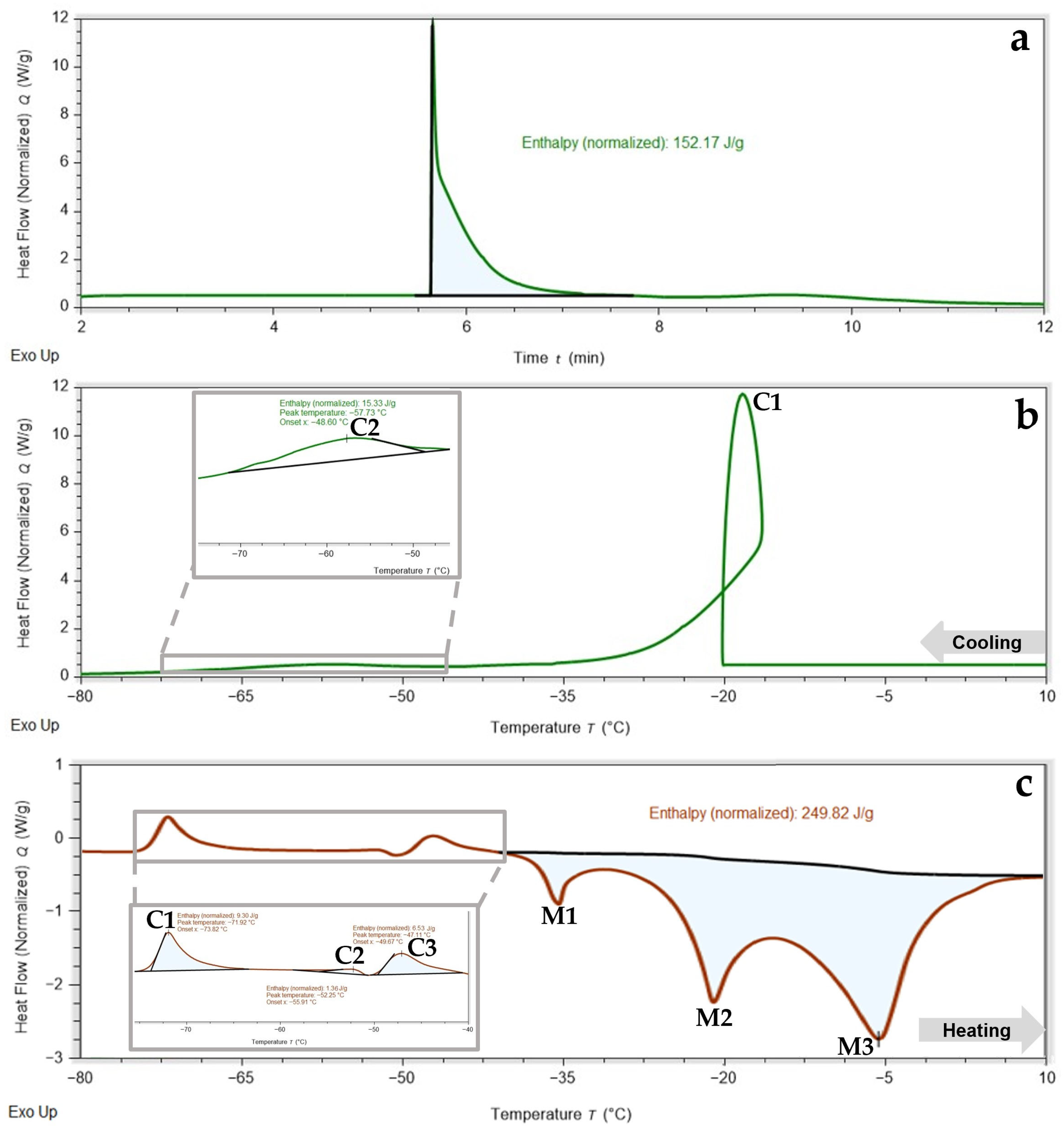 29]. Upon warming, this fraction undergoes delayed crystallization prior to melting. Such behavior is commonly associated with partially vitrified or highly viscous freeze-concentrated phases formed during rapid solute enrichment during freezing.