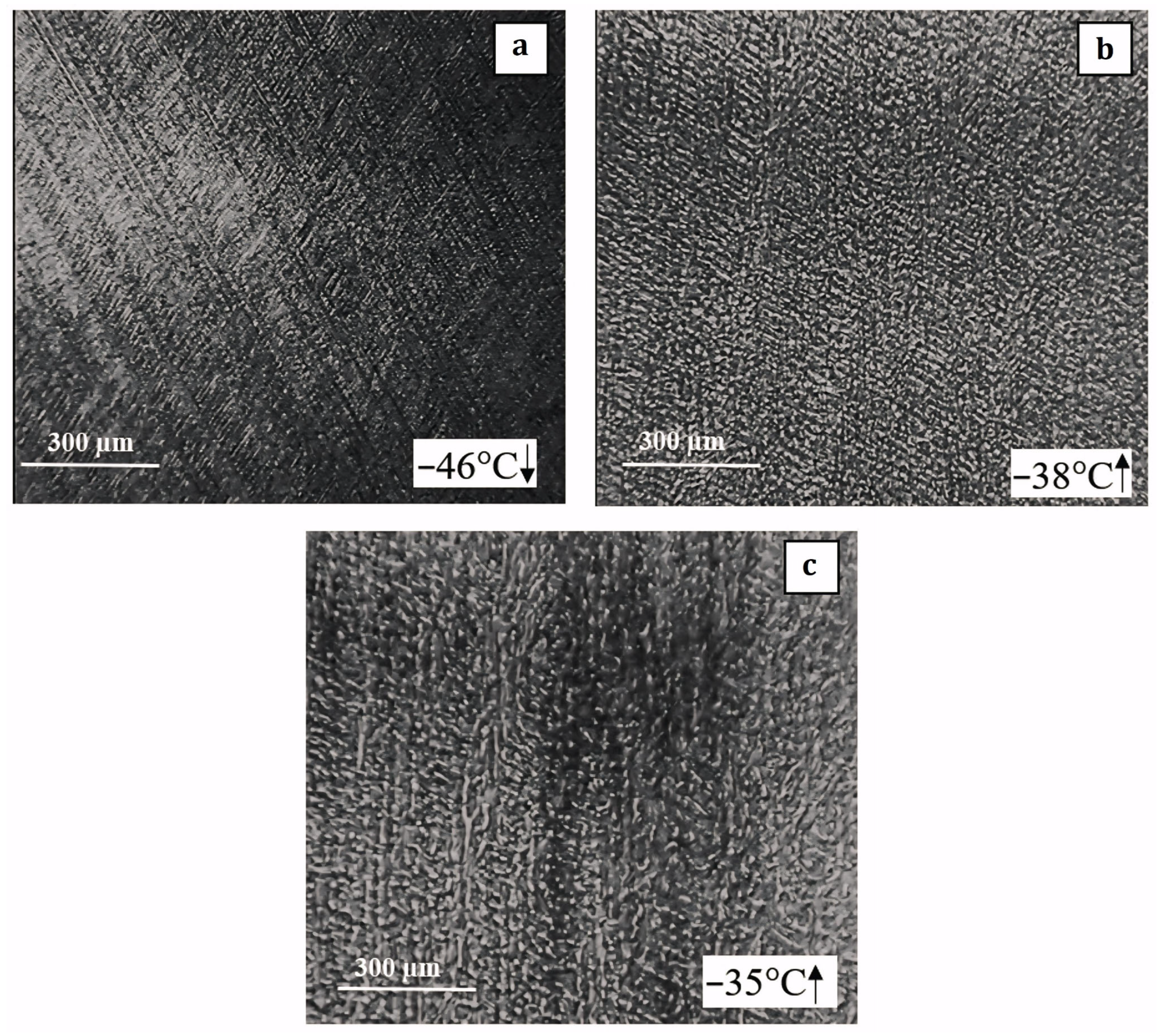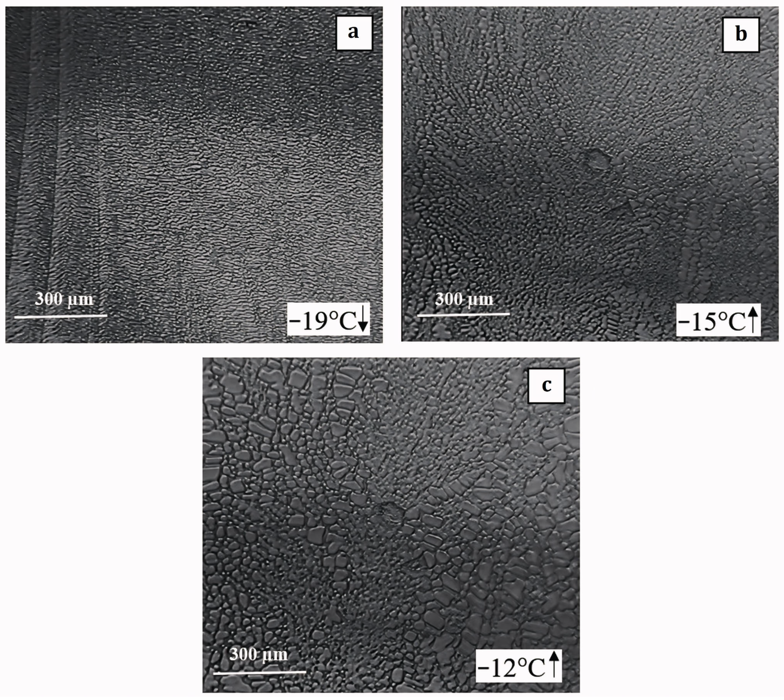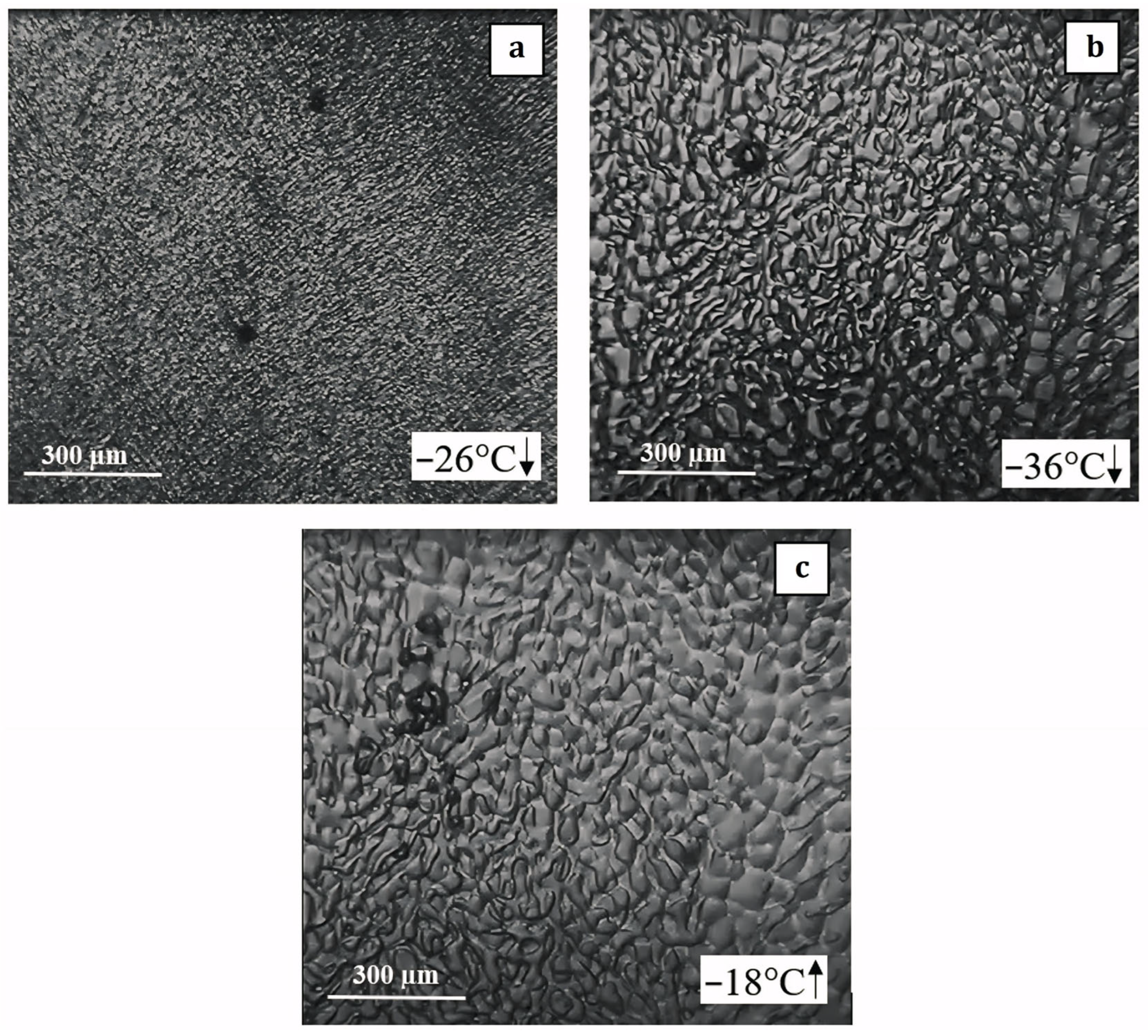 Cryomicroscopy observations strongly supported these calorimetric results. Media with elevated salinity formed fine-grained ice structures during cooling, which persisted during heating with only limited crystal coarsening. In contrast, media with lower effective salinity exhibited pronounced recrystallization during warming. Recrystallization is a key process governing structural evolution in frozen aqueous systems and depends strongly on solute concentration and molecular mobility within the residual liquid phase [