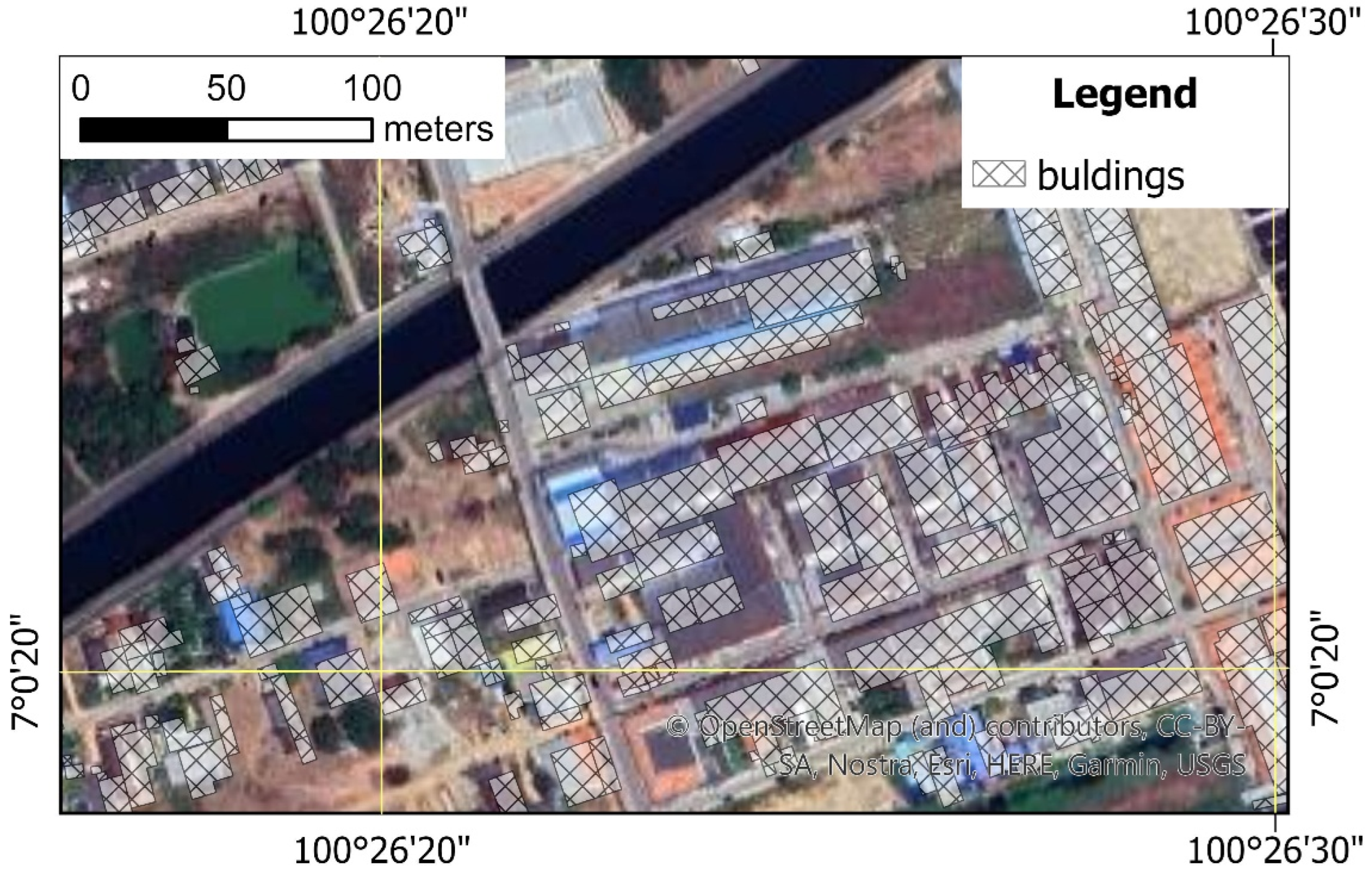 Figure 7, all the elements involved in the analysis are presented. The connections between them are also illustrated. At the top of the scheme, the data preparation processes are presented. The publicly available DEM was processed to improve its resolution. The measurements of the single cross-section along Khlong Wat formed the basis for modifying the terrain. Finally, the terrain with a channel is the core of the topography inserted into the model. The hydrologic observations were processed according to extreme-event analysis procedures, and flood-hazard scenarios were designed. The land cover maps with the additional expert evaluation were the basis for the approximate determination of Manning’s roughness coefficients in the channel and the floodplains. The hydrodynamic model was created and then validated using satellite images and available field observations. The model was implemented to produce approximated inundation maps. The information on possible inundation was compared with data from the OpenBuildings database and land cover maps. The GIS techniques were used to effectively create the risk maps. Finally, the risk was estimated.