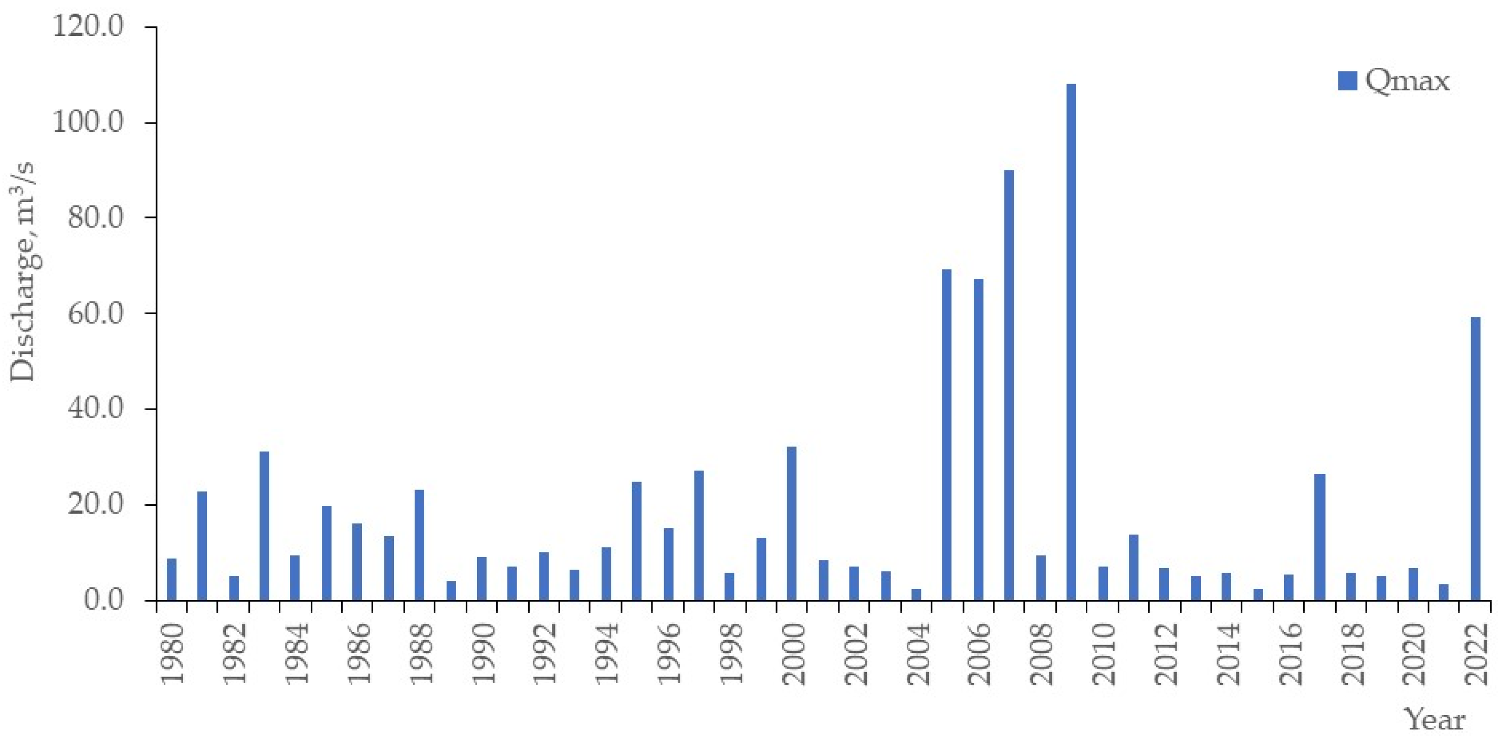 28], with discharge values recorded between 1980 and 2022 ranging from 2.46 to 108 m
