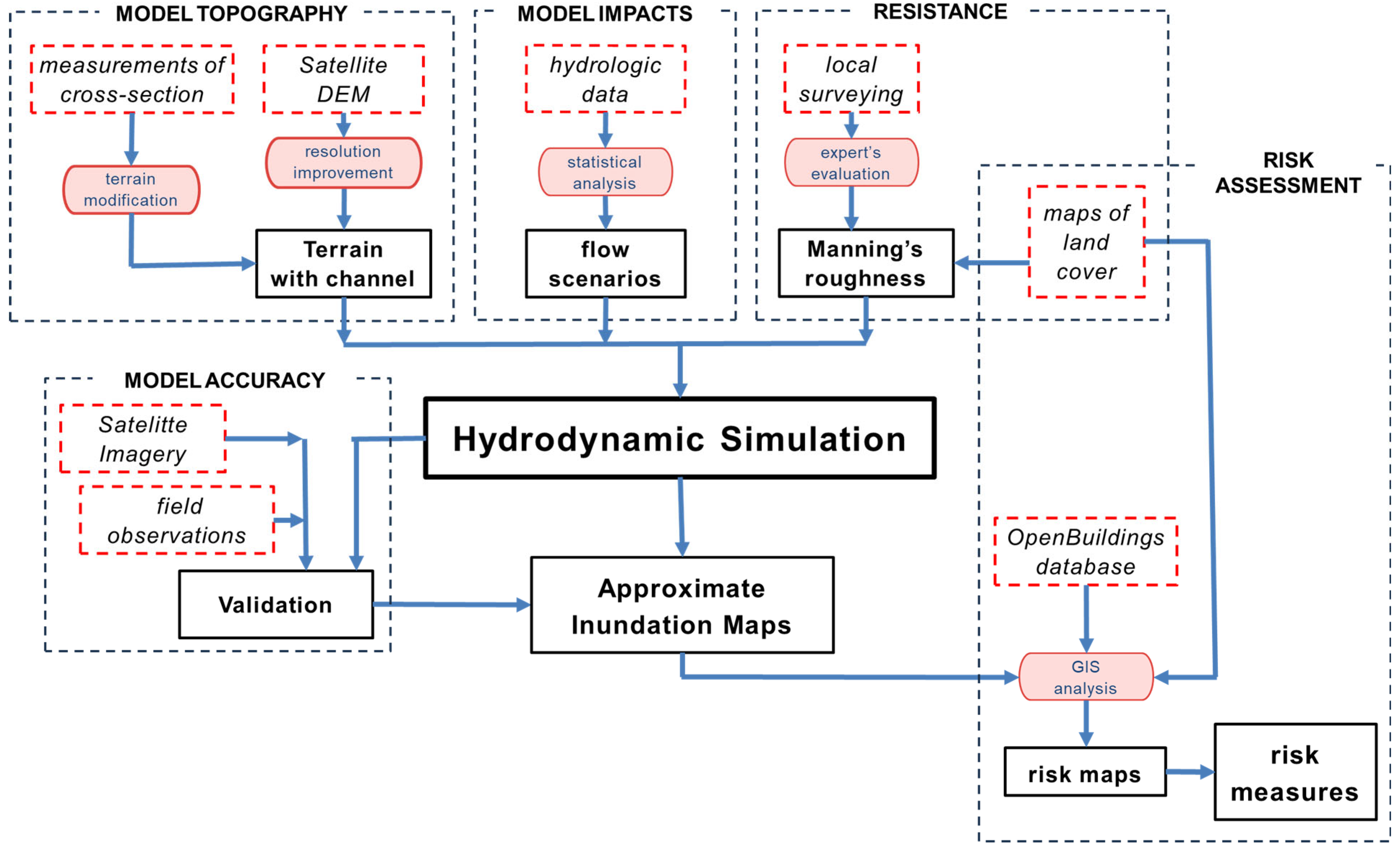 Figure 1). Hence, the scarcity of data in our case affects modeling elements such as reconstructing topography, reconstructing river bathymetry, determining roughness based on land-cover types, and assessing risk to people, e.g., building locations. In the scientific literature, various approaches may be employed to address each of these issues.