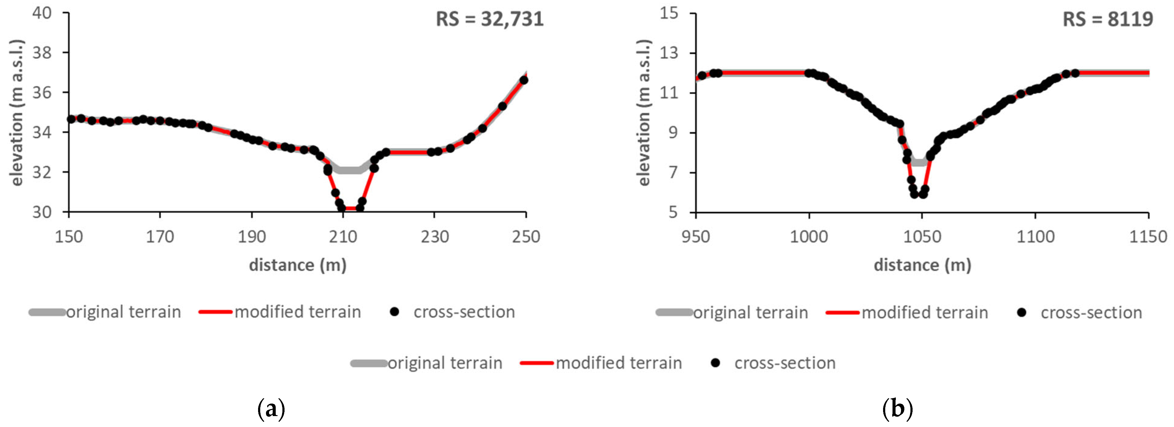 Figure 4. The bathymetric data were used to modify the DEM by adding the river channel. The tools available in the HEC-RAS module, RAS Mapper, were implemented. The module enables modifying the terrain with dikes, channels, and other structures. The channel cross-section, created from the measurement, was added in place of the river visible in the pure DEM data.