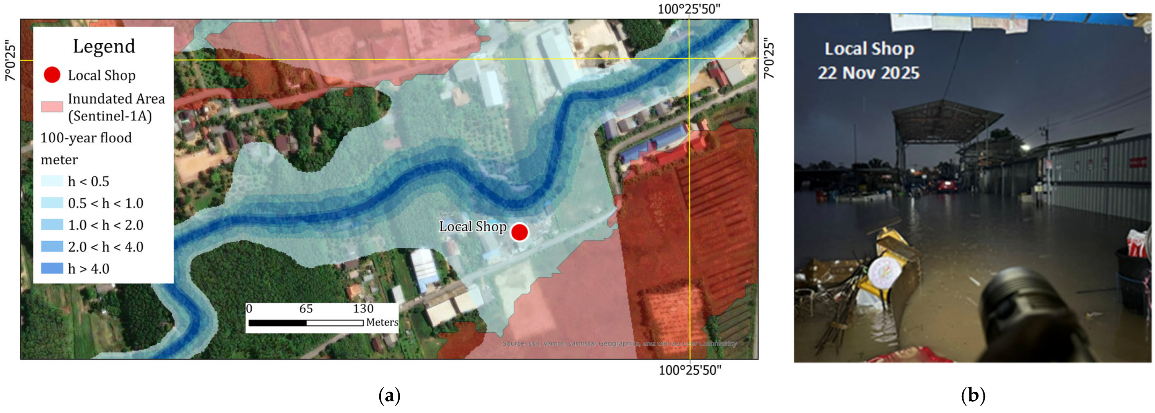 Figure 9, the flood extent interpreted from Sentinel-1A imagery (90 m spatial resolution) partially overlaps with the simulated 100-year return period flood extent. However, due to the relatively coarse spatial resolution, certain localized inundated areas observed in the field were not detected in the satellite-derived map. The ground observation photograph indicates flooding at the site, whereas the satellite product failed to capture this small-scale inundation. In contrast, the simulated flood depth at the observation location was in close agreement with the measured field data, falling within the <50 cm depth class. As illustrated in