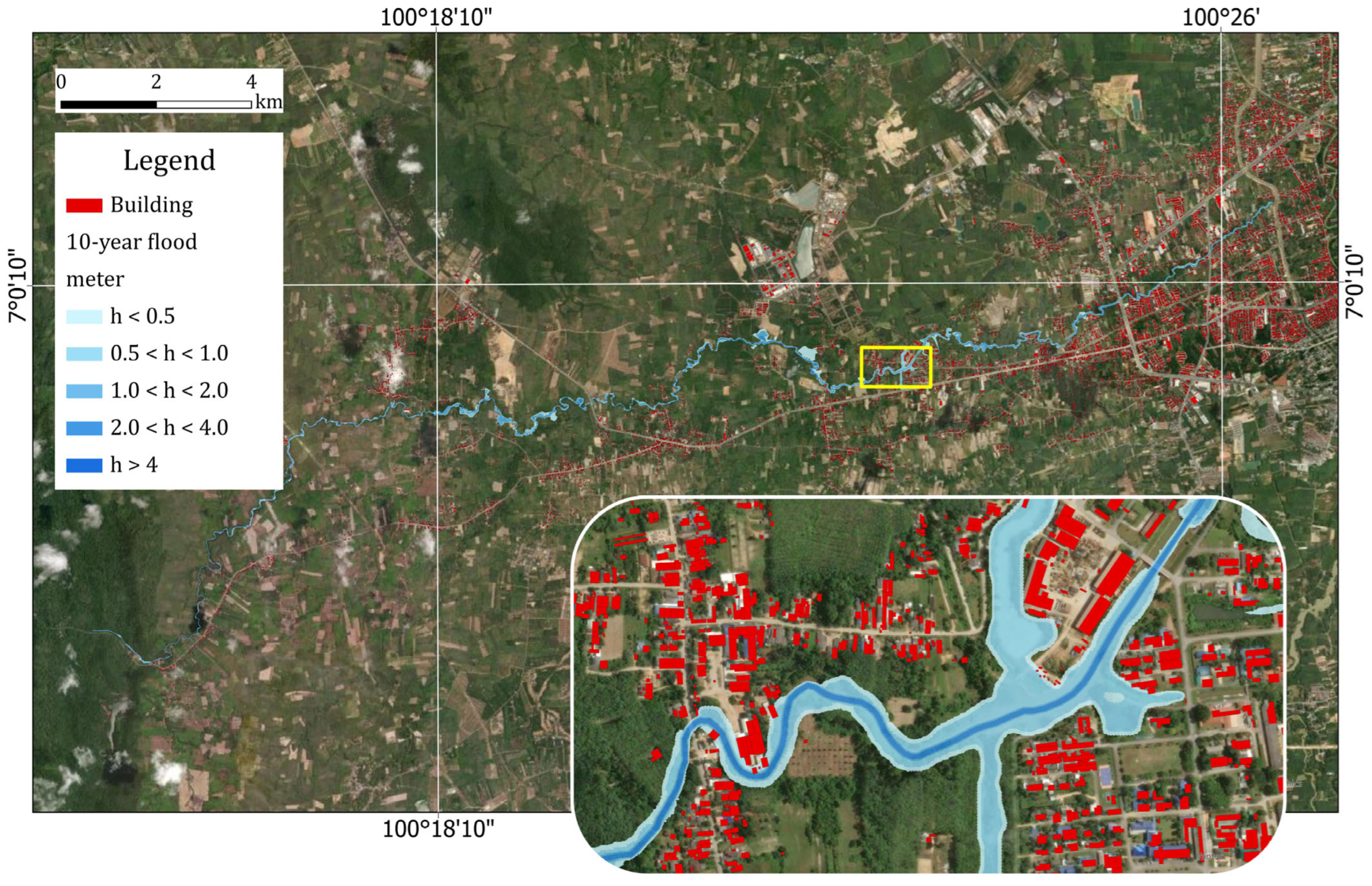 Figure 12. Each of these maps includes a larger example in the entrance to the urban area of Hat Yai city. The buildings are also presented there. Flooding from the upstream Khlong Wat affected four sub-districts in the Hat Yai area: Tha Chang, Khuan Lang, Chalung, and Thung Tam Sao. In all return periods of simulated flood scenarios, inundation predominantly follows the river corridor and expands into the urban area of Hat Yai City as discharge increases. Under the 10-year flood scenario (Q10), flooding remains spatially limited, with shallow water depths and only minor building inundation (
