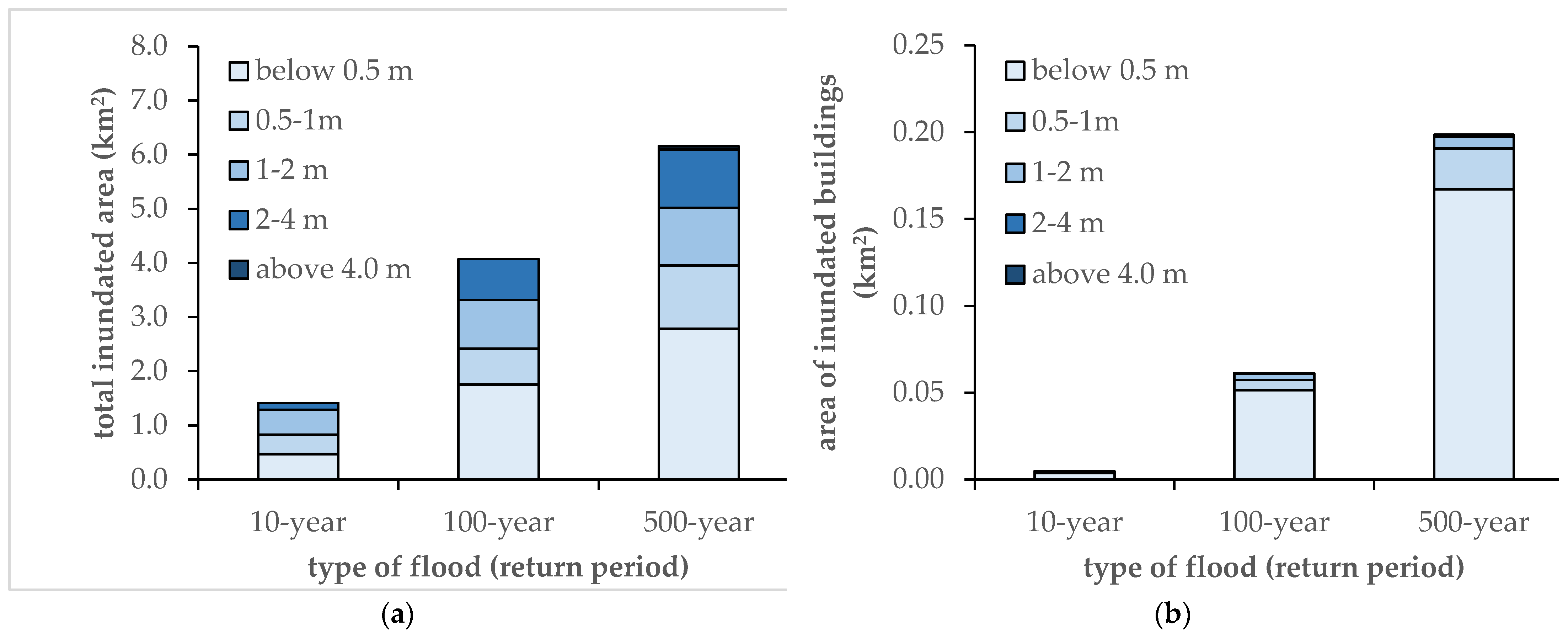 Overall, the results demonstrate that although deeper inundation becomes more extensive with increasing flood magnitude, the majority of building exposure remains concentrated in the shallowest depth class across all scenarios. This pattern reflects a spatial separation between zones of extreme water depth and densely built-up areas. At the same time, an inverse relationship emerges between flood magnitude and the dominance of shallow inundation: while the 10-year event is characterized by widespread but predominantly shallow flooding, the 100- and 500-year floods exhibit substantially greater proportions of deep inundation, particularly in areas containing buildings.