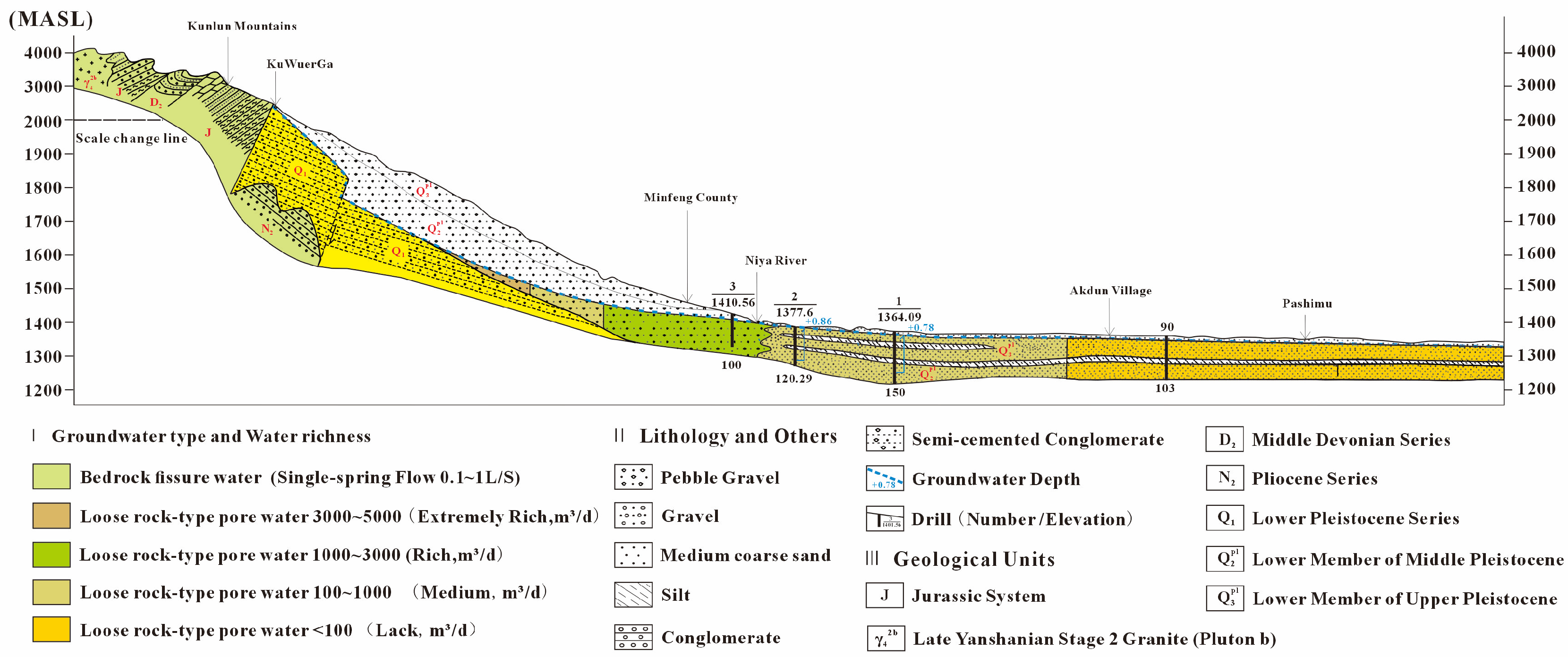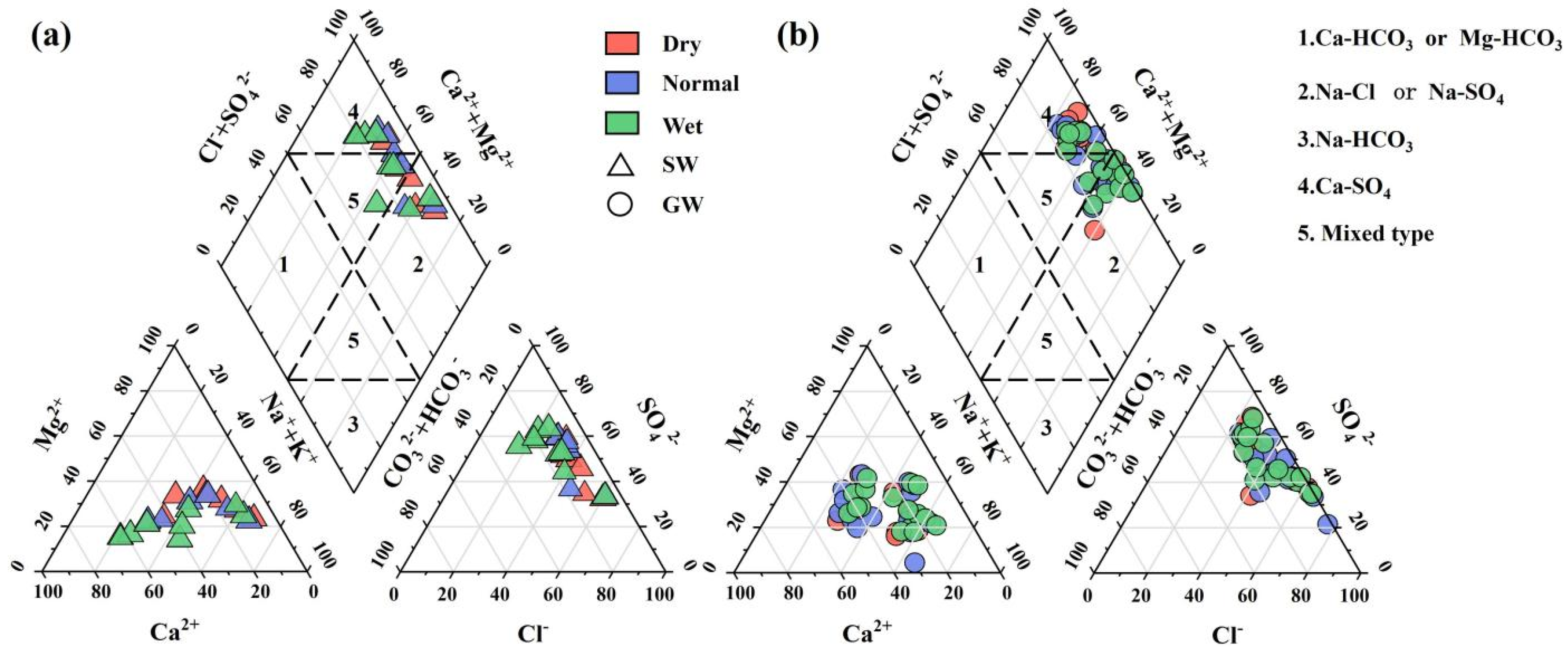 4-Ca and Cl-Na facies, reflecting intensified evaporation concentration and evaporite dissolution. With enhanced recharge from snowmelt and precipitation during the normal and wet periods, sample distributions gradually shift toward the SO