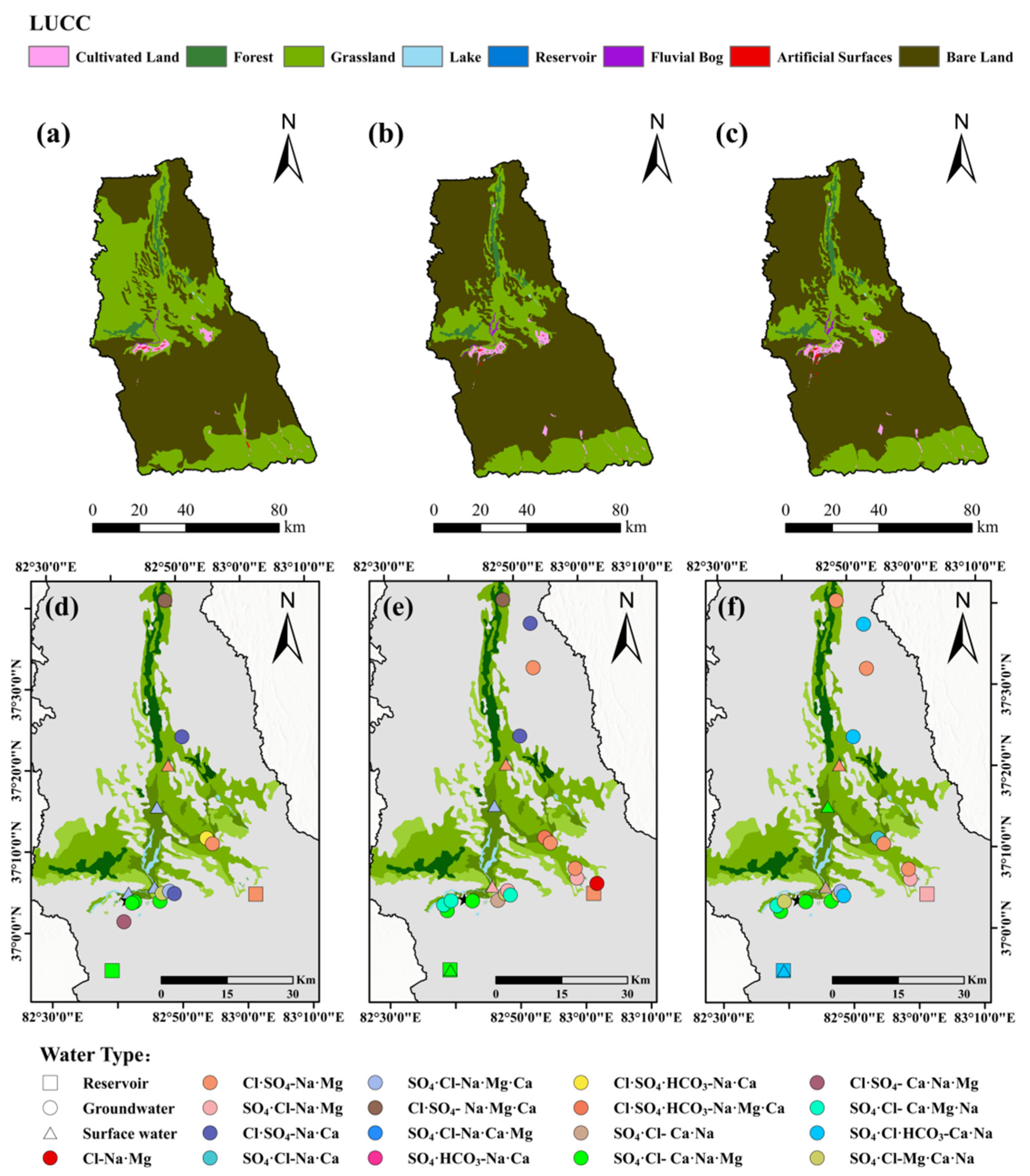 +. This systematic enrichment reflects prolonged residence time and sustained water–rock interactions, potentially compounded by irrigation return flow inputs and evaporative concentration. Notably, hydrochemical facies of in situ groundwater in the middle and lower reaches substantially overlap with adjacent surface water types, providing further evidence of strong hydraulic connectivity and active solute exchange, consistent with previously observed similarities in TDS and ionic composition. A distinct seasonal salinity inversion is observed in the middle reaches. During the dry period, surface water exhibits higher salinity than groundwater, whereas during the normal and wet periods, groundwater salinity surpasses that of surface water. This seasonal reversal reflects dynamic shifts in recharge dominance. In the dry period, groundwater contributes to surface water through baseflow discharge, elevating surface water salinity. Conversely, during the normal and wet periods, intensified infiltration of meltwater and precipitation enhances surface water recharge to groundwater. Under the combined influence of recharge and intensified water–rock interaction, solutes re-accumulate in groundwater, resulting in elevated salinity. These findings indicate that the surface water–groundwater system alternates between recharge-dominated and discharge-dominated regimes across hydrological periods. To further evaluate the influence of anthropogenic activities on hydrochemical evolution, remote sensing-derived land use data from 2000 to 2020 were analyzed (