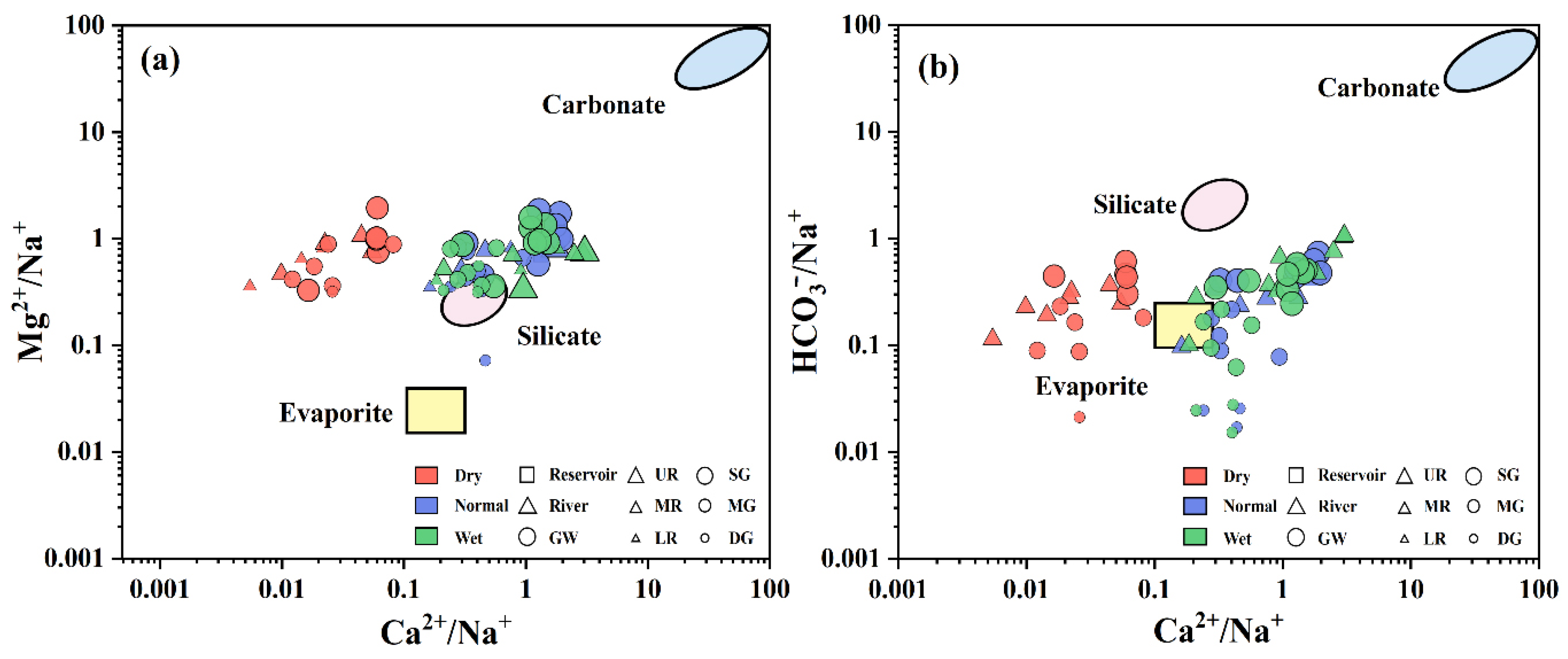 34]. Moreover, longer residence times in intermediate and deep aquifers facilitate continued evaporite dissolution and cation exchange, promoting progressive solute enrichment. To further discriminate the relative contributions of different lithological weathering processes, end-member diagnostic diagrams of Mg
