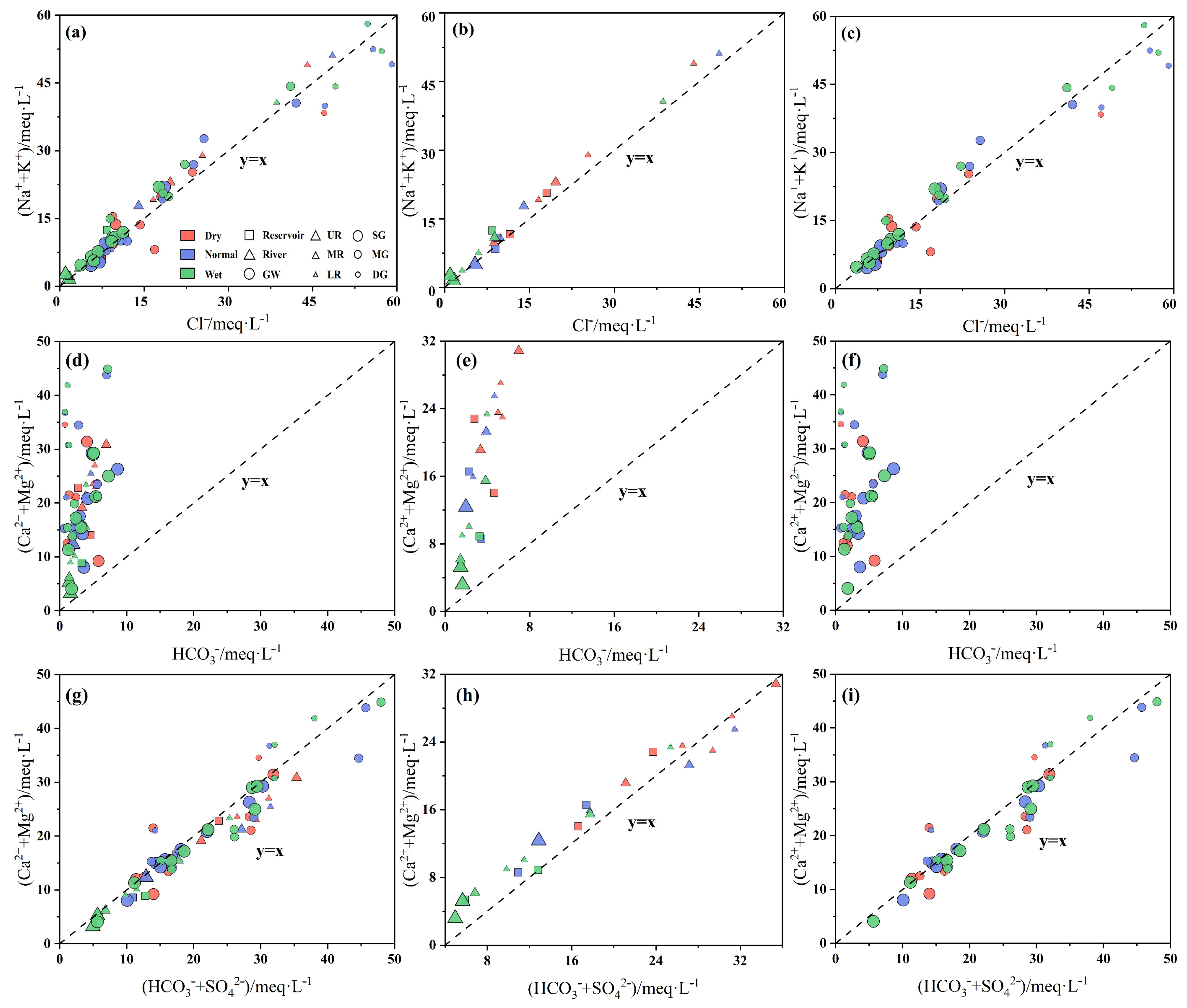+, suggesting that gypsum dissolution and, to a lesser extent, silicate weathering also contribute to solute enrichment. Within the surface water system, inter-ionic correlations strengthen markedly during the wet period. In particular, correlations among Na