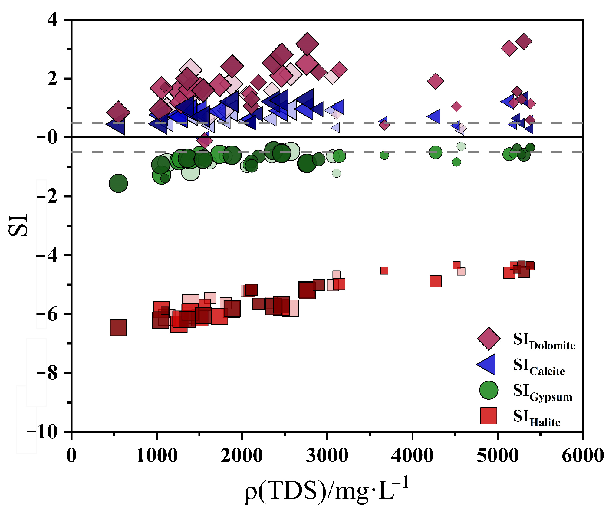 To further elucidate the thermodynamic characteristics of water-rock interactions governing groundwater chemistry, saturation indices (SI) for calcite, dolomite, gypsum, and halite were calculated using PHREEQC. Variations in SI were evaluated in relation to TDS to infer mineral dissolution-precipitation trends (