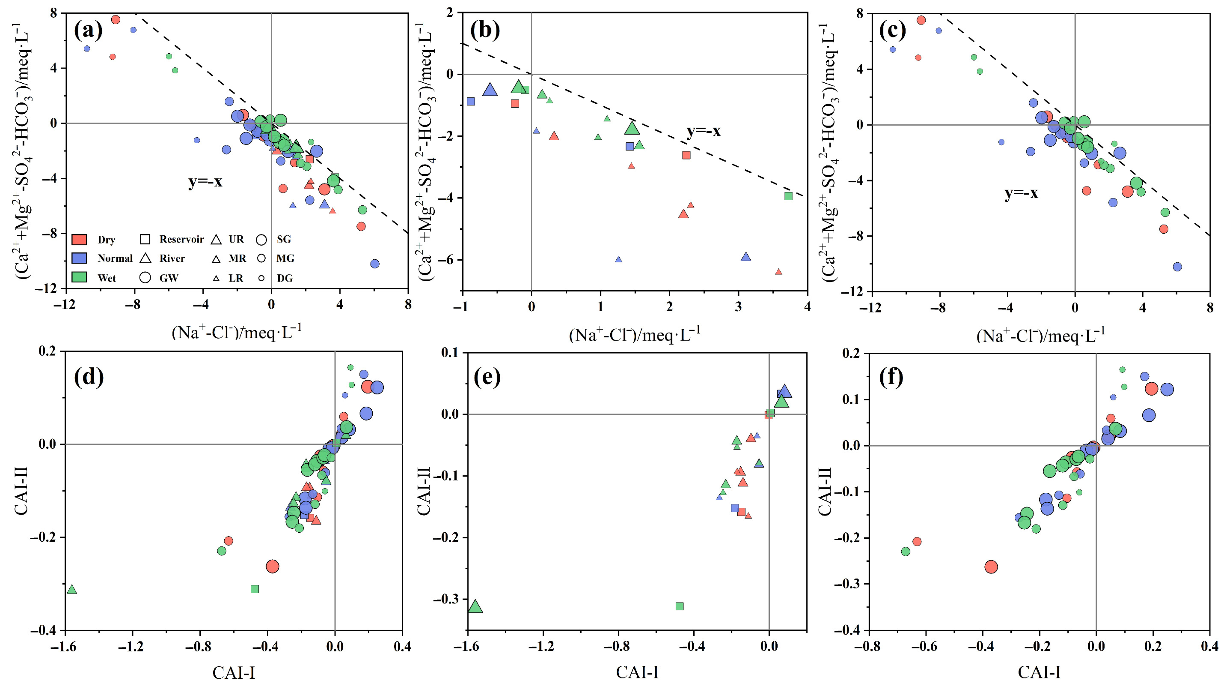 Figure 10a–c, the majority of surface water and groundwater samples distribute near the y = −x line, confirming the widespread occurrence of cation exchange reactions. Groundwater samples exhibit a more coherent alignment along the theoretical trend, whereas surface water samples display greater dispersion. This contrast suggests that cation exchange exerts a stronger and more systematic influence on groundwater evolution, while surface water chemistry is subject to additional processes such as direct recharge dilution, evaporation concentration, and short-term hydrodynamic variability. Seasonal comparison further reveals that the intensity of cation exchange in surface water follows the order: wet period > normal period > dry period. In groundwater, the sequence differs slightly: wet period > dry period > normal period. Enhanced exchange during the wet period likely reflects increased infiltration of irrigation return flow and river water, which promotes interaction between recharge water and exchange sites within aquifer materials. Interestingly, the influence of cation exchange varies with groundwater depth and hydrological period. During the dry and normal periods, the relative intensity follows the order: deep groundwater > intermediate groundwater > shallow groundwater. In contrast, during the wet period, the pattern reverses to shallow > intermediate > deep groundwater. This seasonal inversion may be associated with intensified agricultural irrigation during the wet period, which enhances shallow aquifer recharge and stimulates exchange reactions in the upper groundwater system. Deeper groundwater, characterized by longer residence time and more stable geochemical conditions, appears less responsive to short-term recharge variability. Chloro-alkaline indices (CAI-I and CAI-II) provide additional confirmation of exchange processes (