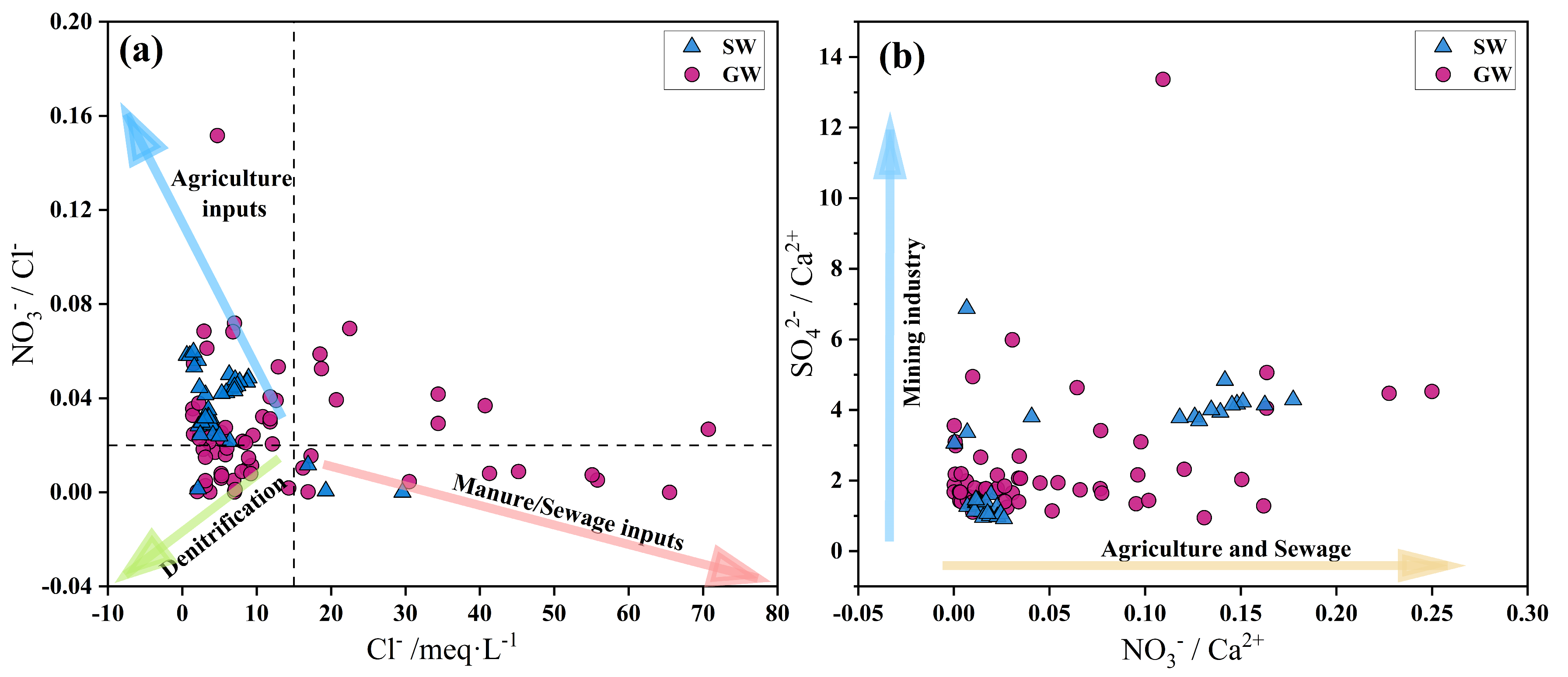 42−) as sensitive indicators of anthropogenic contamination derived from industrial exploitation, wastewater discharge, livestock manure, and fertilizer application [