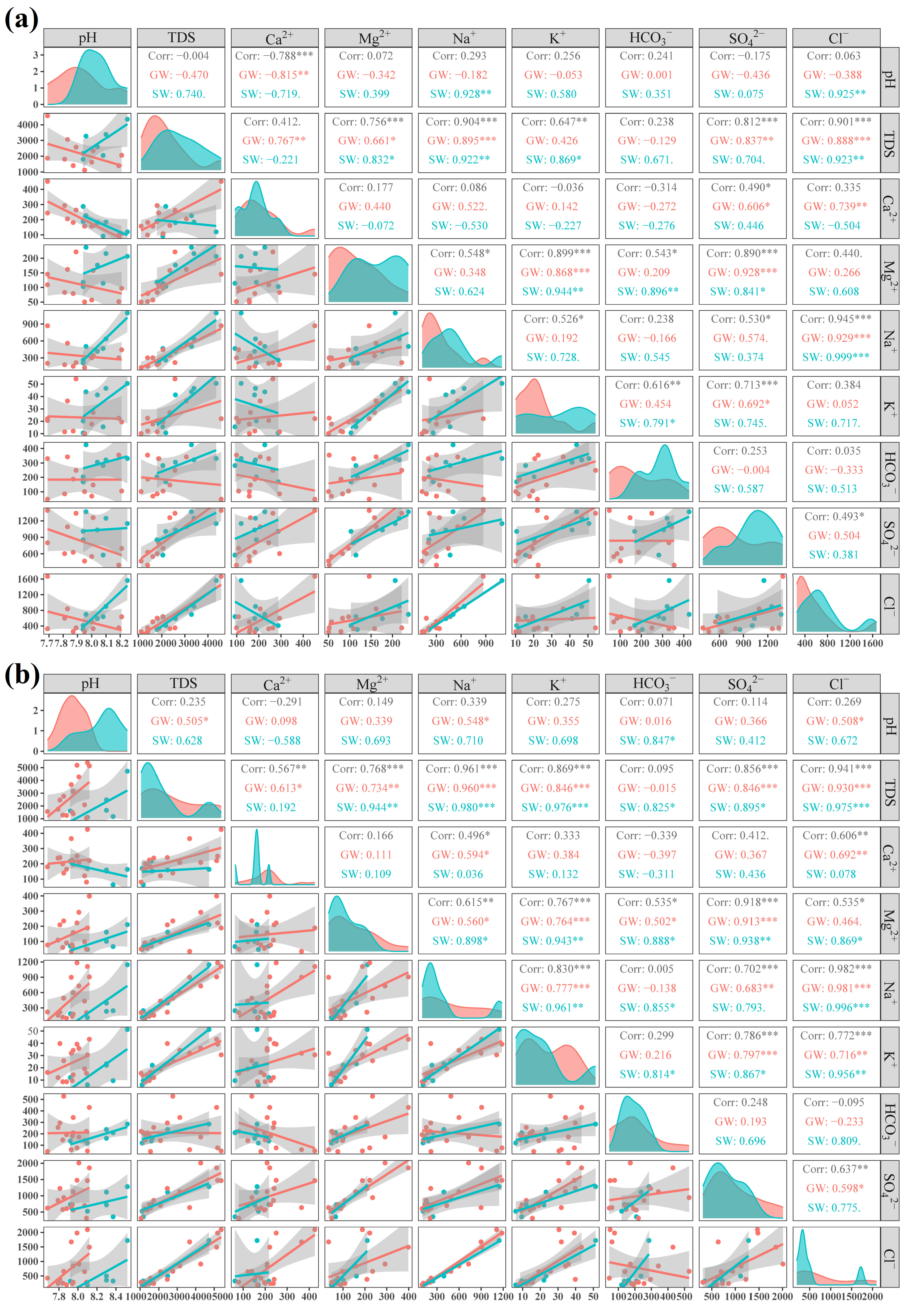To further elucidate potential common sources and governing mechanisms among dissolved ions, Pearson correlation analysis was conducted for nine hydrochemical parameters in surface water and groundwater across different hydrological periods (