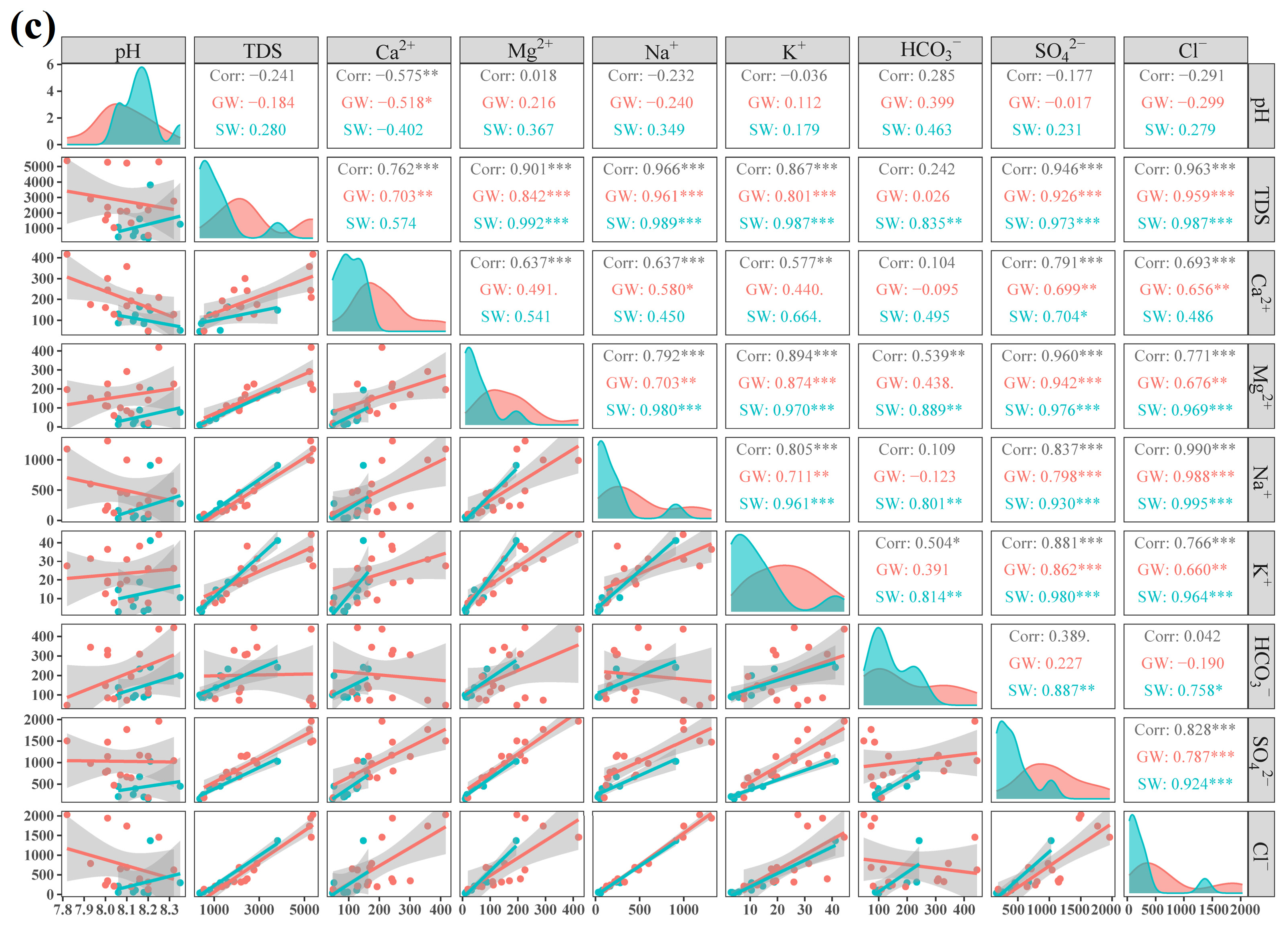 Figure 13). The correlation structures exhibit pronounced variability among seasons and between water types, reflecting strong spatiotemporal heterogeneity in hydrogeochemical processes within the basin. At the overall level, TDS show consistently strong positive correlations with Na