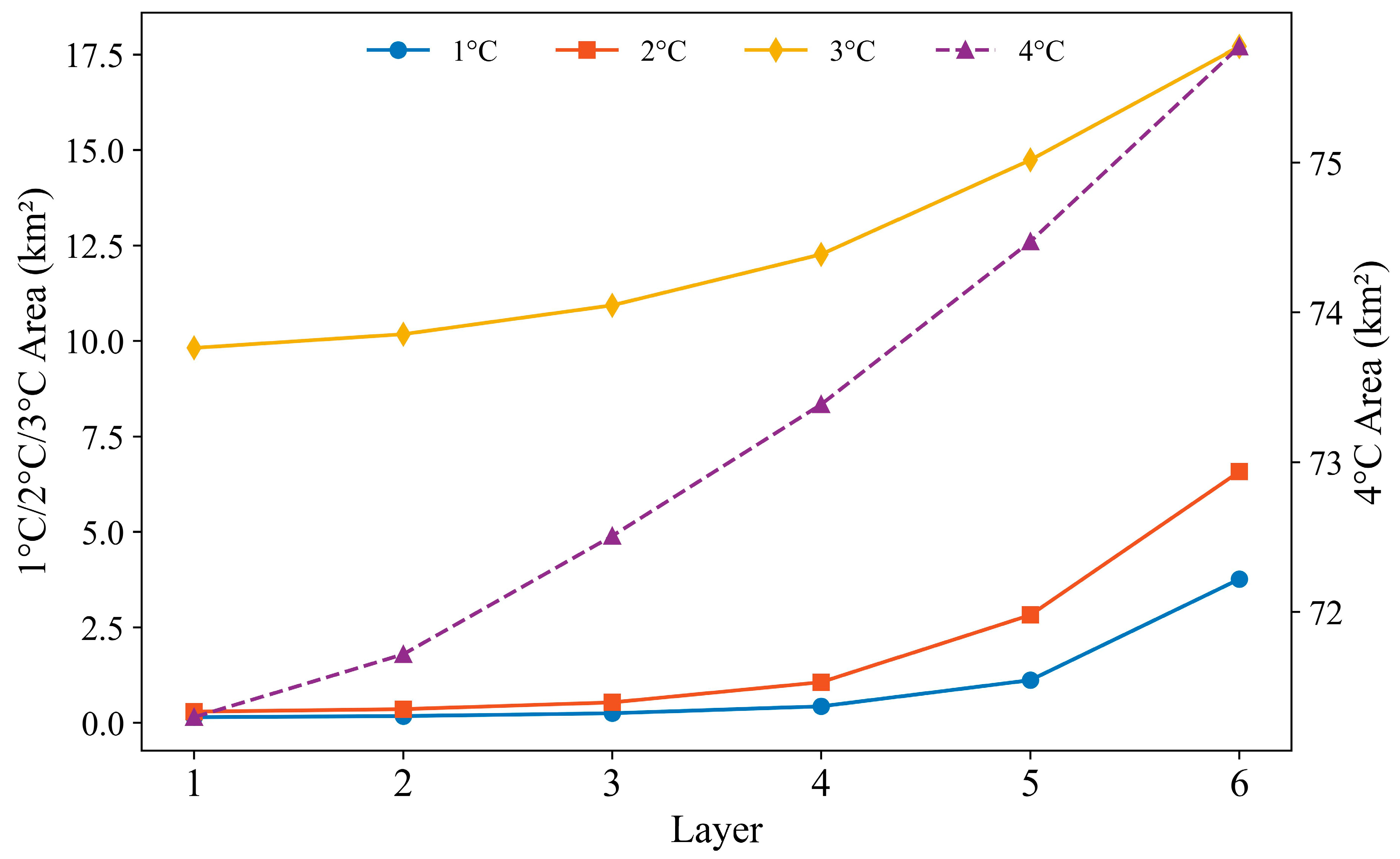 - When assessing impacts in the high temperature rise region (): The model should incorporate a detailed longwave radiation scheme, as longwave radiative loss represents the primary mechanism of heat dissipation in this region. Latent and sensible heat fluxes may be parameterized using simplified bulk formulations, given their relatively minor contributions.