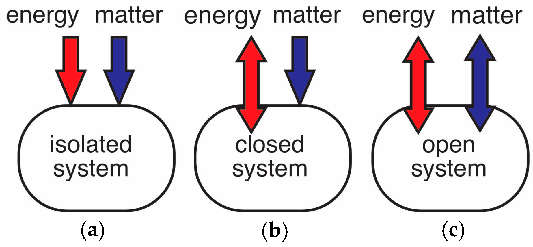 Figure 1. Three types of thermodynamic systems: (a) isolated, (b) closed, and (c) open systems (red arrows show the direction of energy flow, and blue arrows show the direction of matter flow).