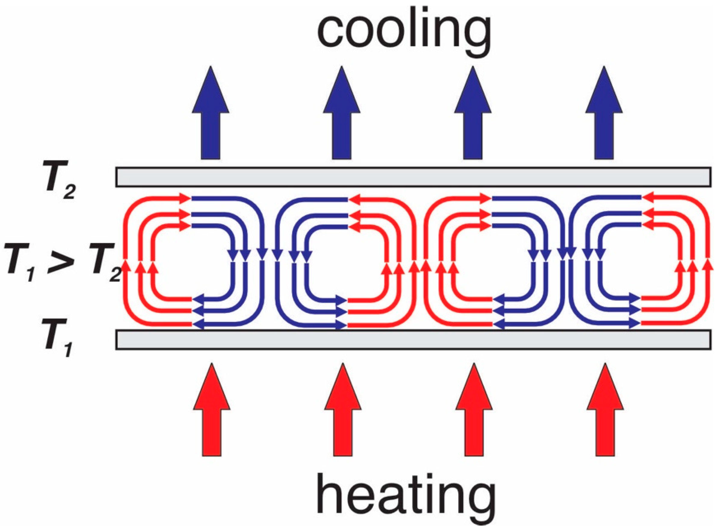 Figure 2. Schematic of experiments on convection in a thin layer of fluid heated from below (red arrows show heating and blue arrows show cooling).