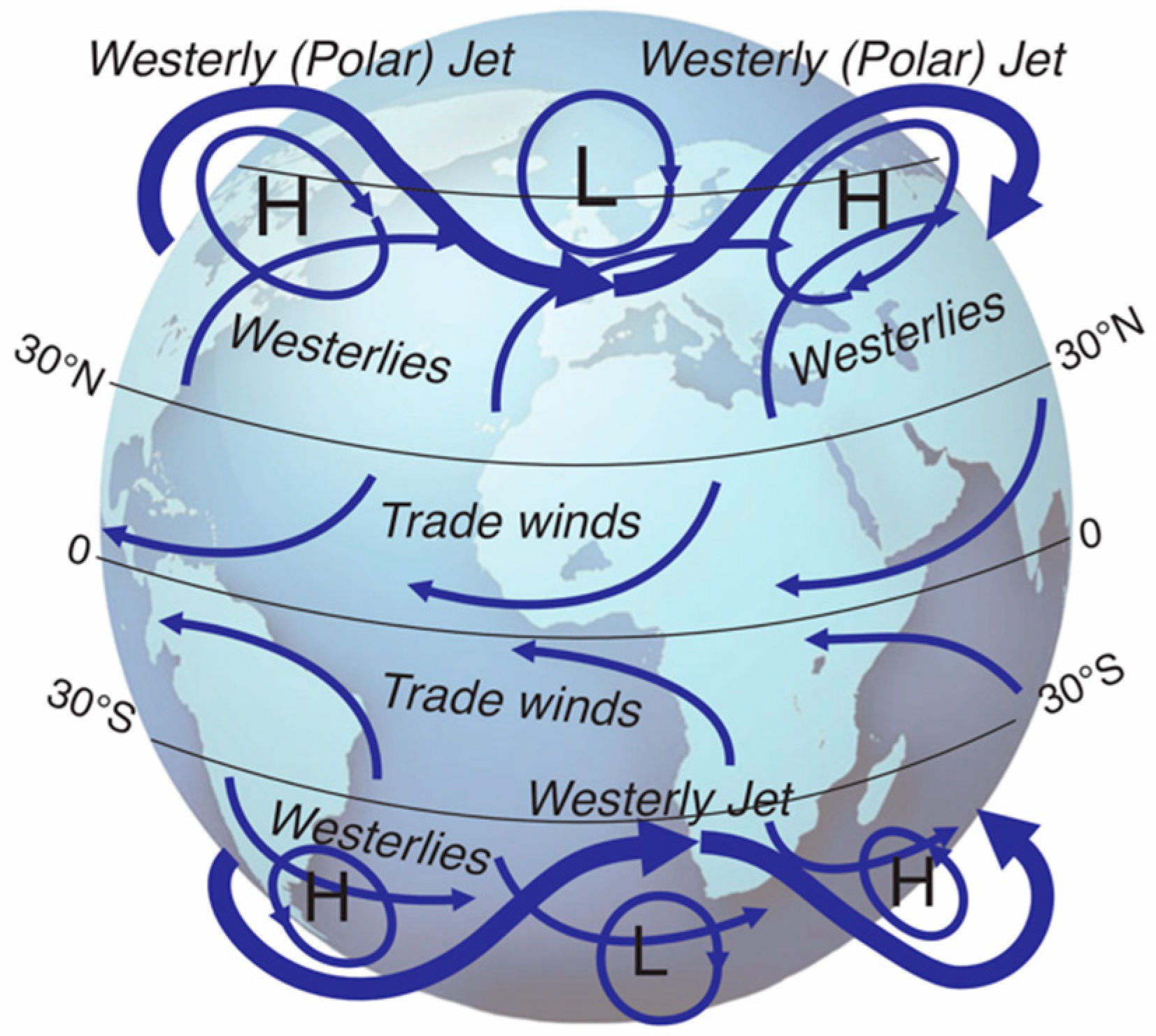 Figure 3. Schematic of westerly (polar) jets, trade winds, and other weather elements of global atmospheric circulation; H and L inside the circles indicate the high and low pressure in anticyclones and cyclones, respectively.