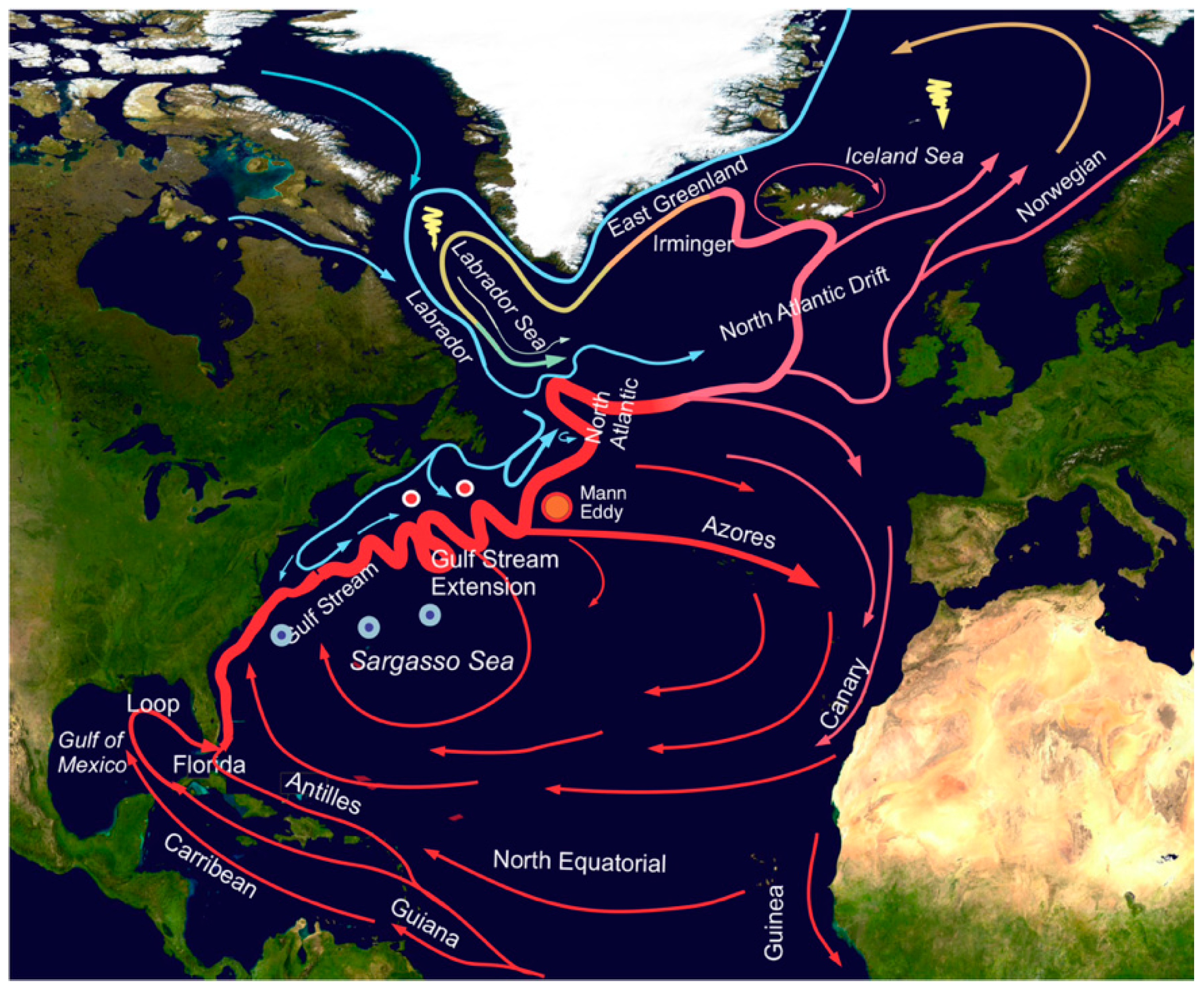 The third and most crucial distinction between oceans and the atmosphere is that oceans are enclosed by landmasses. Western boundary currents are formed because of the Earth’s spherical geometry and rotation, which are key features of the horizontal dissipative structure known as ocean general circulation. The Gulf Stream in the North Atlantic is a prominent example. North Atlantic circulation is shown in Figure 4. Eddy–jet interactions generate a very strong jet that becomes unstable and, like atmospheric jet streams, meanders and sheds circular eddies, known as rings. In ocean jet dynamics, meanders and rings are much smaller than those in the atmosphere because air flows are significantly faster.