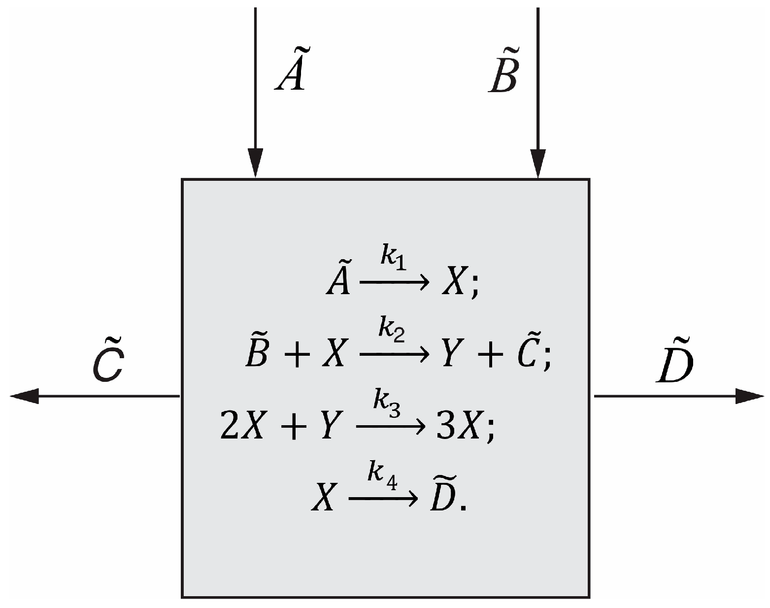 In Equation (1), X and Y are the results of the interaction between certain substances A ~ , B ~ , C ~ and D ~ The concentrations A ~ and B ~ are kept constant, and substances C ~ and D ~ are removed from the reactor. The combined reaction is à + B ~   C ~ + D ~ , which means that there is a through-flow of substances in the reactor, as illustrated in Figure 5.