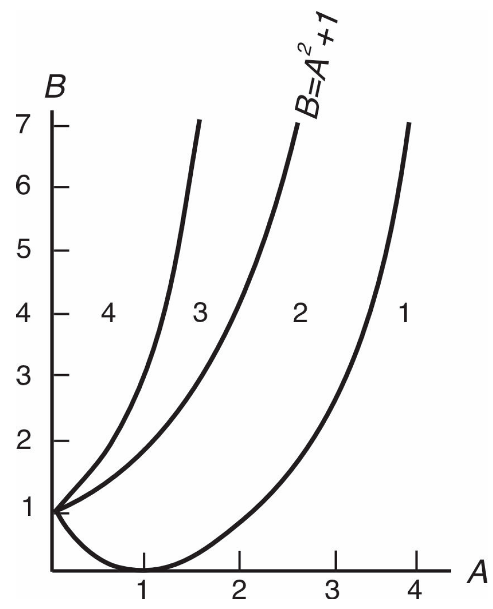 System behavior is determined by parameters A and B and becomes unstable when parameter B passes through a critical value, BCR, known as the bifurcation value (the value at which a dynamic system undergoes a sudden qualitative change in behavior). Figure 6 shows the regions to the right and left of the parabola B = A2 + 1, which separate the stable nodes (Region 1), stable foci (Region 2), unstable foci (Region 3), and unstable nodes (Region 4). The curve at which the real part of the roots passes through zero corresponds to purely periodic regimes, that is, centers.