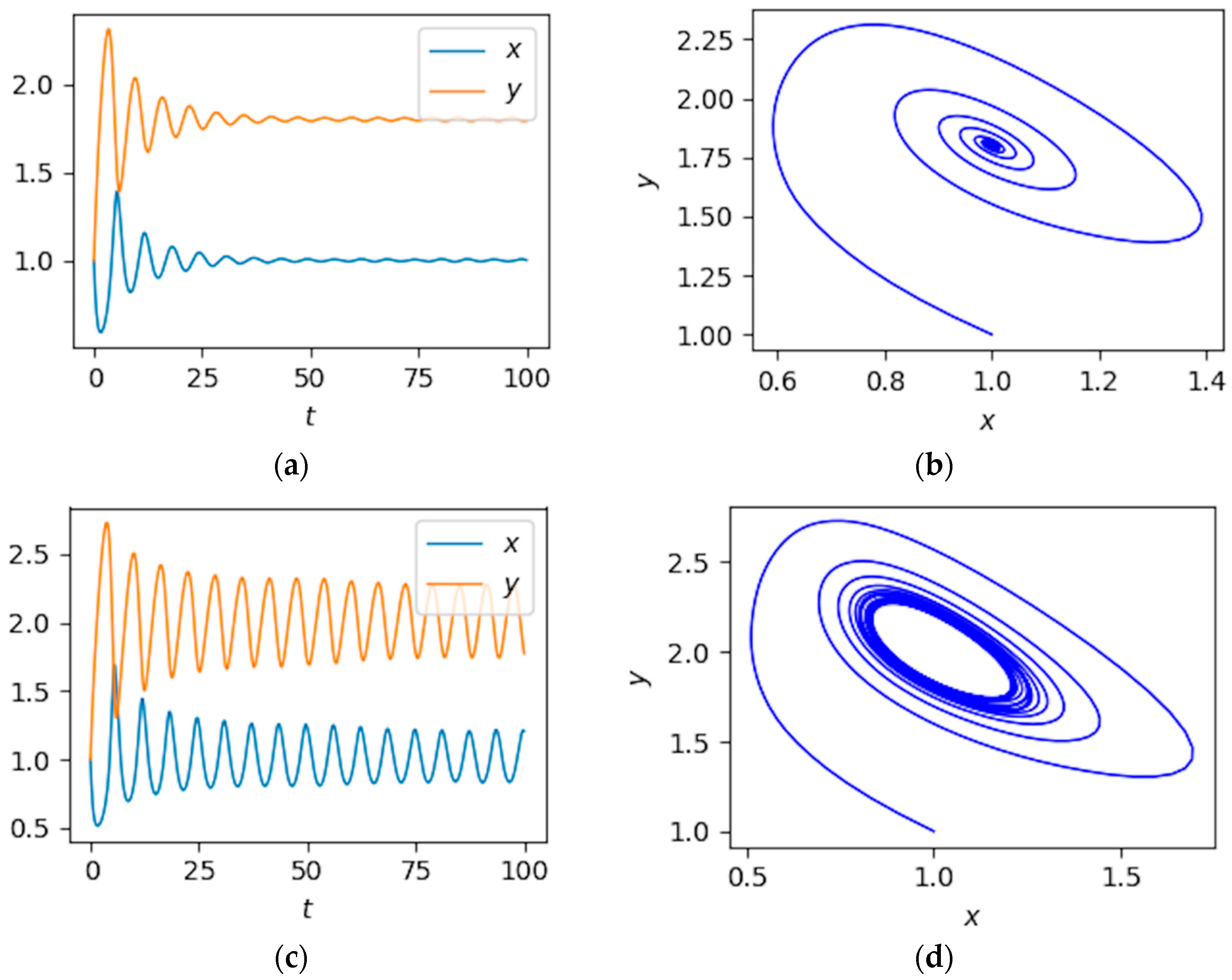 The Brusselator model is a widely recognized simple theoretical model of auto-oscillation that illustrates the Hopf bifurcation when parameter B surpasses its critical value of A2 + 1. Although this model can be implemented in any programming language, Python 3 is arguably the most suitable and user-friendly option. Brusselator codes are readily accessible online and in several textbooks. For example, a code from the textbook [16] was adapted using two sets of parameters suggested in the cited source: (1) A = 1, B = 1.8, and (2) A = 1, B = 2.02. Figure 7 depicts these two scenarios, with the left panels (a) and (c) displaying the time series of the solutions x and y, and the right panels (b) and (d) illustrating the phase portraits of the system in phase space (x,y).