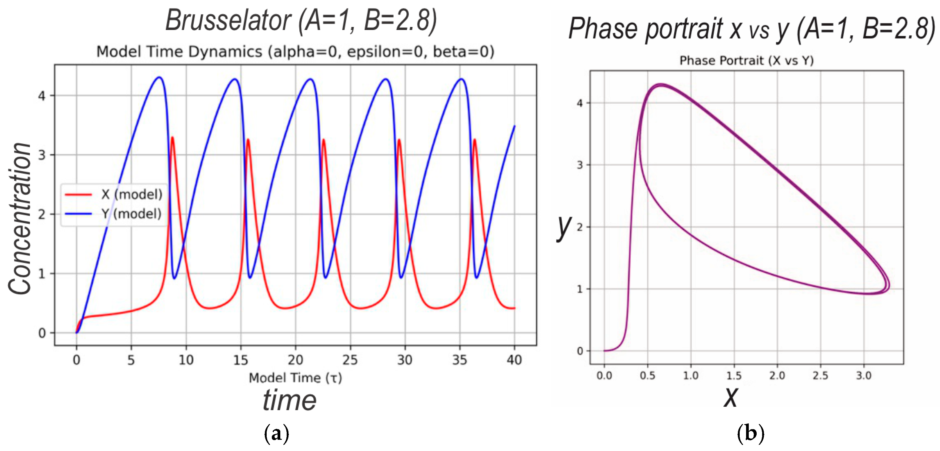A more detailed explanation is required for the transformation of Equations (2) and (3) into Equations (4) and (5). In nonlinear dynamical systems, it is common practice to transform the governing equations into a dimensionless form through normalization (scaling), thereby reducing the number of independent parameters and revealing the fundamental structure of the system. In the case of the Brusselator, the original reaction rate constants k 1 k 4 are absorbed into the scaling of variables and time, leading to a reduced system governed by two control parameters, A and B , which determine the dynamical regime of the system.