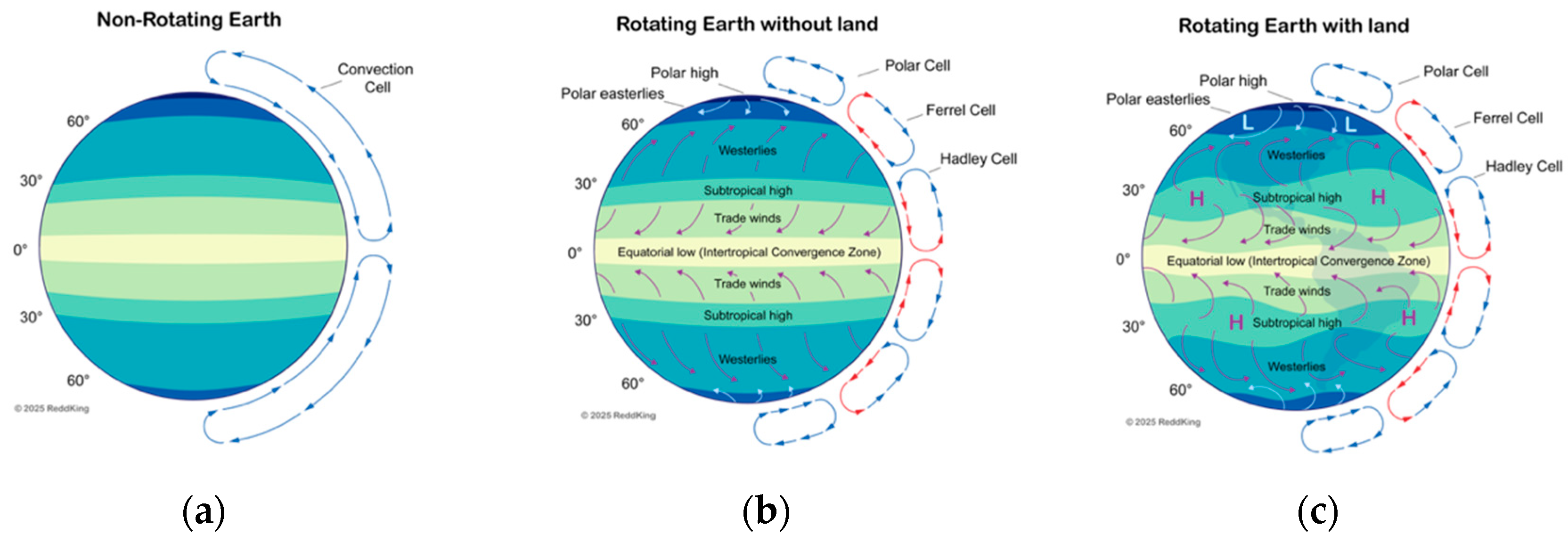 Figure 9. Atmospheric convection systems in a single Hadley Cell on a non-rotating planet without land (a), a three-cell convection system consisting of the Hadley, Ferrell, and Polar cells on a rotating planet without land (b), and the same as in (b) on Earth, that is, a rotating planet with ocean–land distribution (c). Reproduced from Wikimedia Commons (under the CC BY-SA 4.0 license).