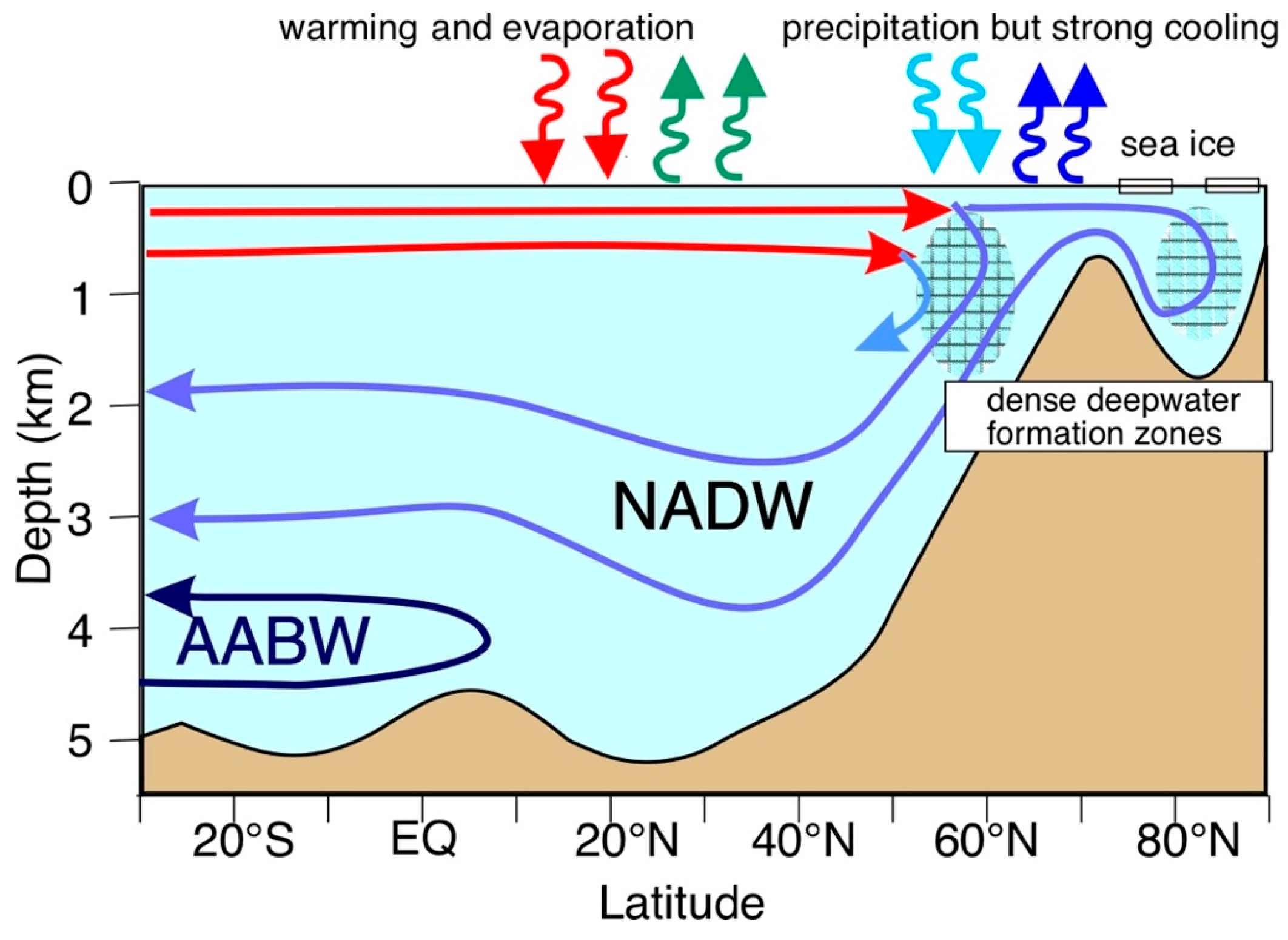 Figure 10. Schematic representation of AMOC and NADW formation (reproduced from [6]); the waving arrows at the surface indicate warming (red), cooling (blue), evaporation (green), and precipitation (light blue); the warm northward currents are shown by red arrowed lines, the cold NADW flow is indicated by blue arrowed lines, and the cold AABW incursion is shown by black arrowed line.