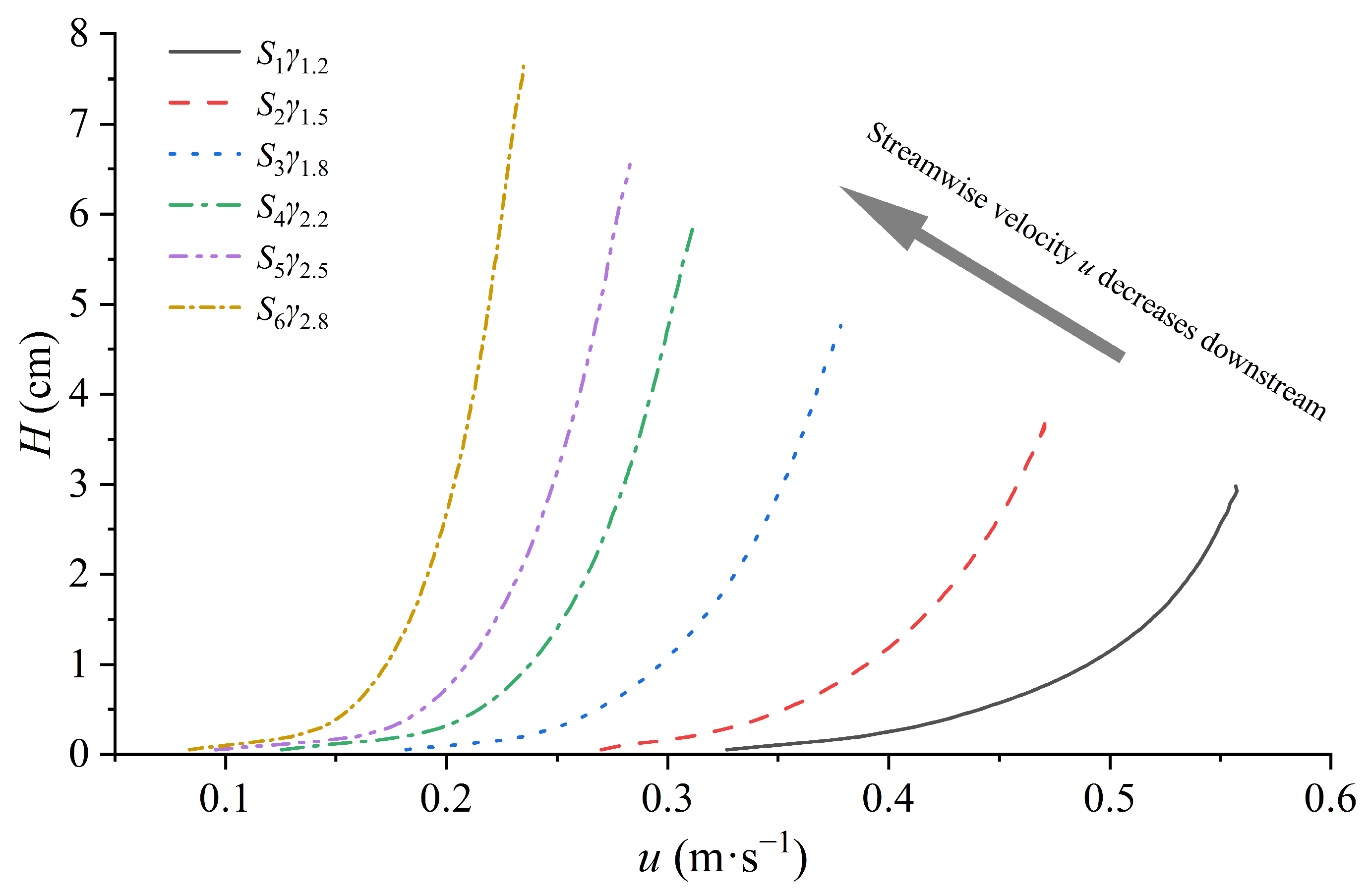 | Section | X (m) | J | H (cm) | γ | U (m/s) | υ (10−6 m2/s) | u* (cm/s) | Fr | Re | Reτ |