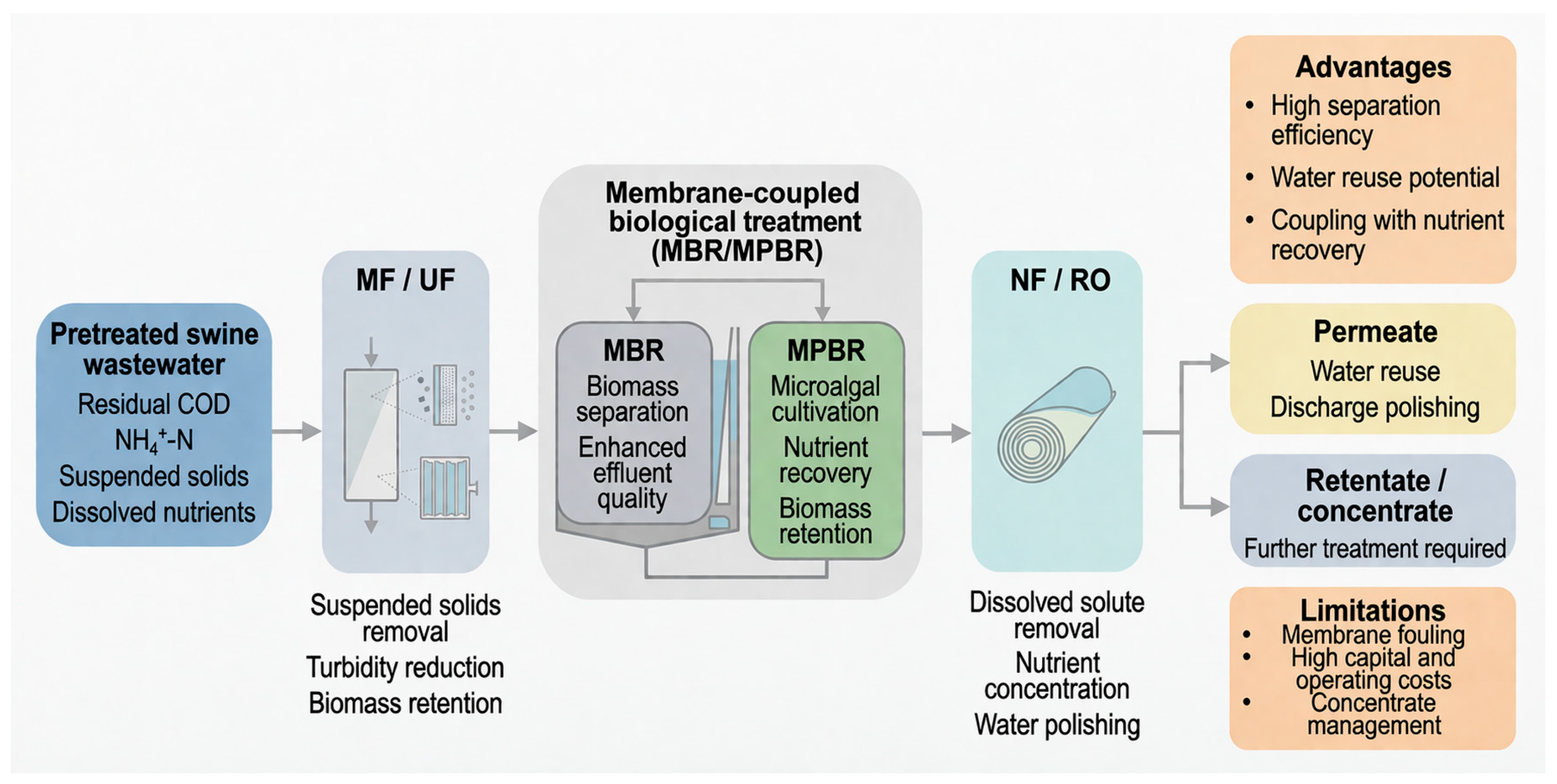 | Influent C/N ratio | Low-C/N digestate and swine wastewater are critical operating contexts | Affects the relative contribution of algal assimilation, nitrification–denitrification, and nutrient recovery pathways | TN removal route distribution; carbon utilization; process stability | [104,122] |