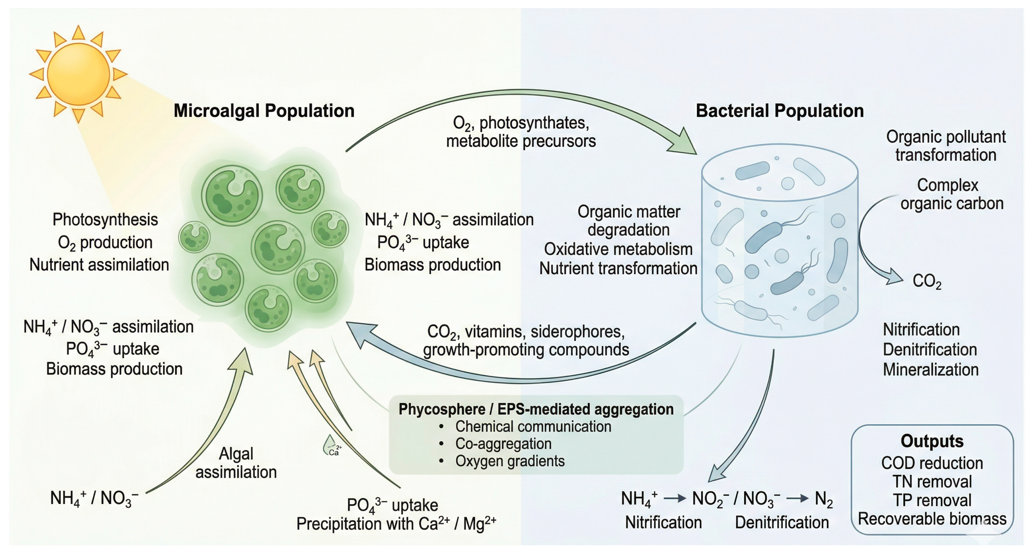 | Algal–bacterial ratio | Example reported optimum: 1:0.2 | Alters metabolic complementarity and the balance between assimilation-dominated and transformation-dominated nutrient removal pathways | Biomass increment; TN/TP removal and recovery efficiency | [19,67] |