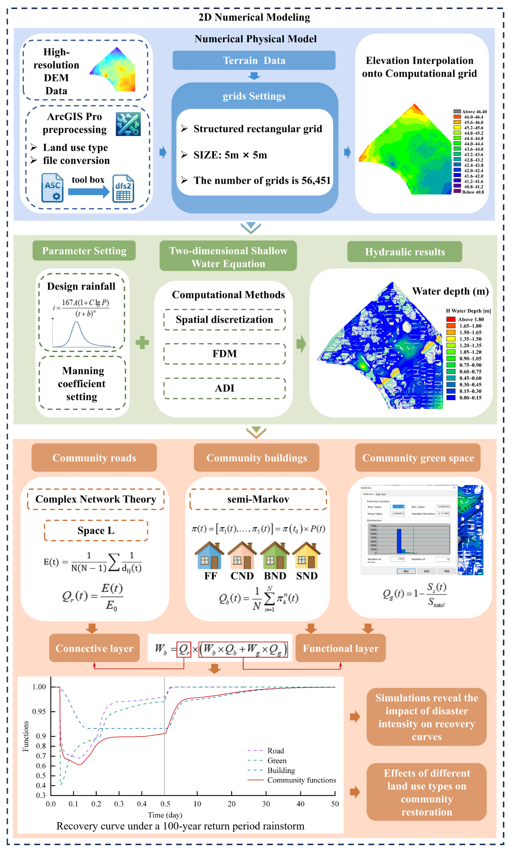 Figure 1. First, the MIKE 21 hydrodynamic model simulates community inundation processes under short-duration heavy rainfall, yielding high-precision dynamic flood depth data to provide physical disaster factors for subsequent analysis. Building upon this foundation, differentiated recovery calculation models were developed for distinct land use types within the community. A semi-Markov process was employed to model the recovery of individual buildings, and the functional capacity of buildings within the community was aggregated to derive building recovery curves. A road network topology model is constructed using the Space L method, with community road functionality quantified via network global efficiency metrics. Green space functionality loss is quantified based on the percentage of flooded areas. Finally, considering interactions between different systems, a community functionality quantification model linking connectivity and functionality layers is developed, yielding recovery curves.