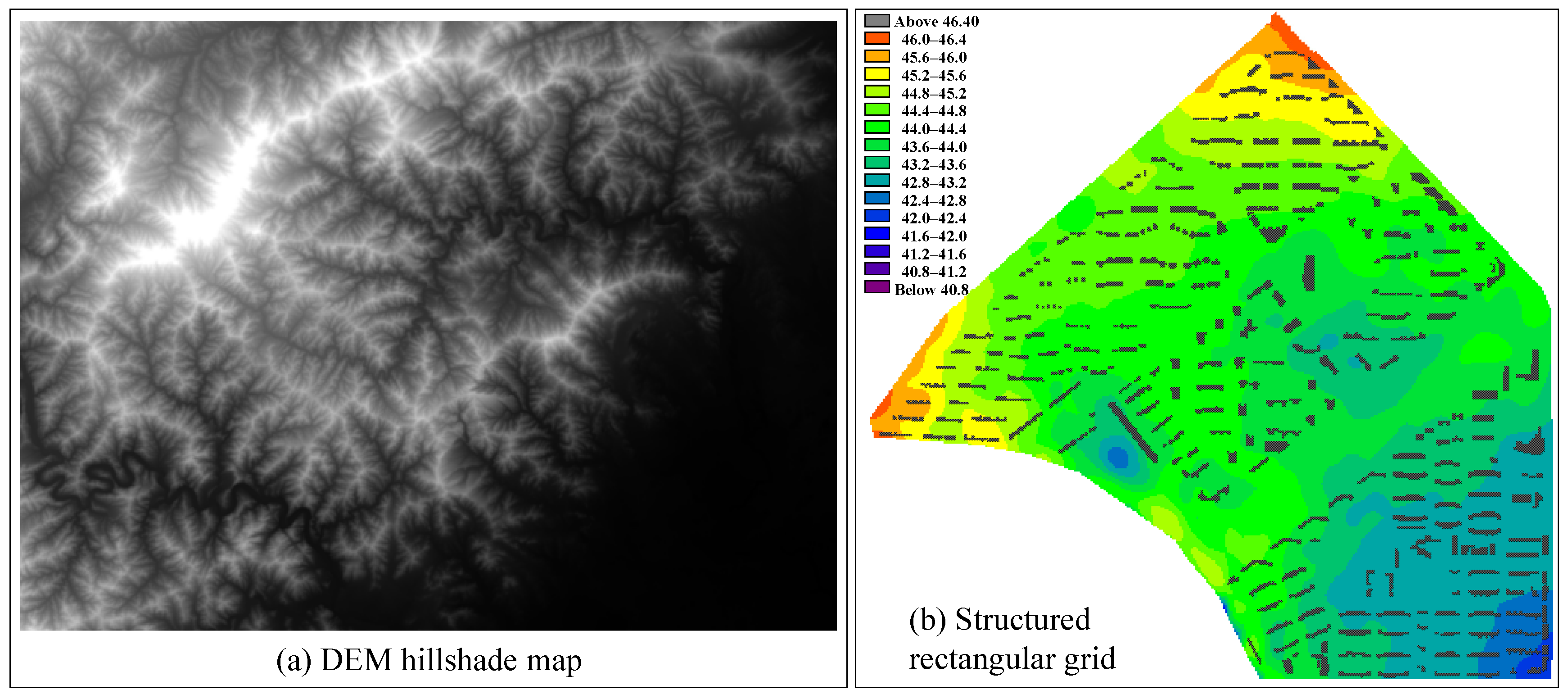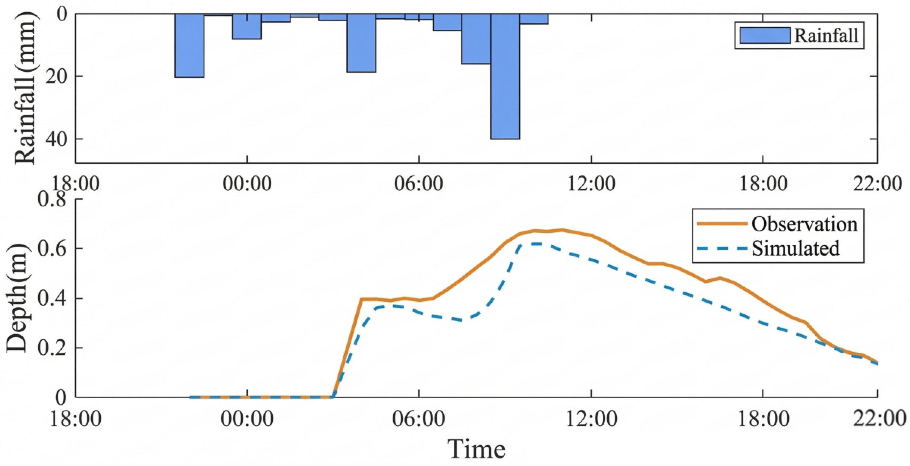 Surface roughness is a core parameter in hydrodynamic models that characterizes the resistance of the underlying surface to water flow. It is represented in the model by the Manning coefficient n. Its essence lies in quantifying the dissipation rate of flow energy by rough elements such as riverbeds, banks, and surface vegetation, thereby reflecting the resistance characteristics of different underlying surfaces to water movement. Within the governing equations, roughness indirectly influences momentum exchange calculations through the bed friction term, directly affecting both the attenuation rate of flow velocities and the elevation of water levels. Properly setting roughness values is fundamental to ensuring the model’s accuracy in simulating critical hydrological parameters like water levels and flow velocities. Based on the Outdoor Drainage Design Standard and empirical values from similar research, this study assigns initial roughness values to different land cover types: a Manning coefficient (n) of 0.025 for buildings, 0.11 for green spaces, 0.03 for roads, and 0.02 for bare soil.