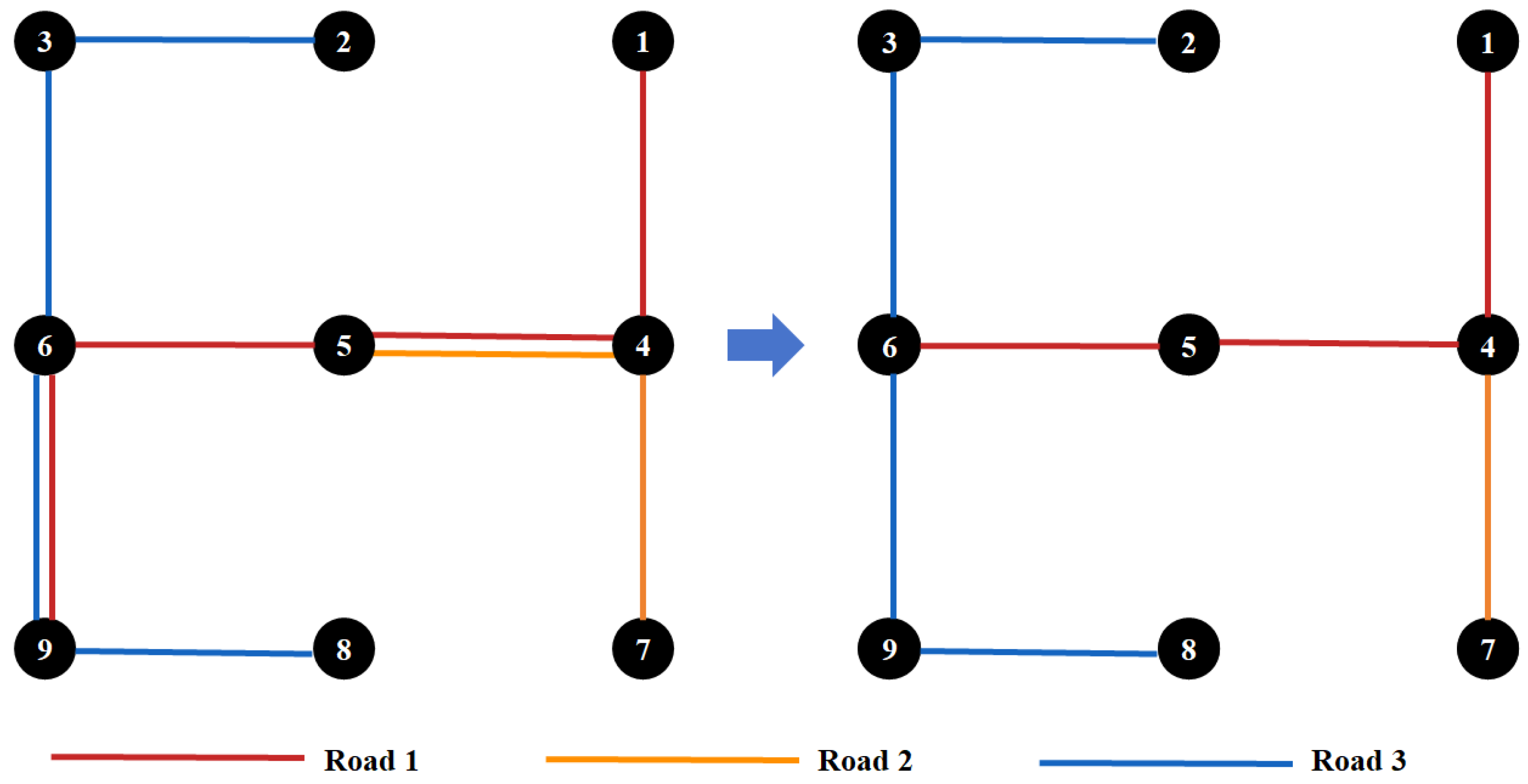 vj. In graph theory, the existence of an edge strictly corresponds to a direct traffic route between two points in physical space; 3. Initial weighting W reflects differences in capacity among road tiers. This study selects time as the edge weight. In the initial state, the weight