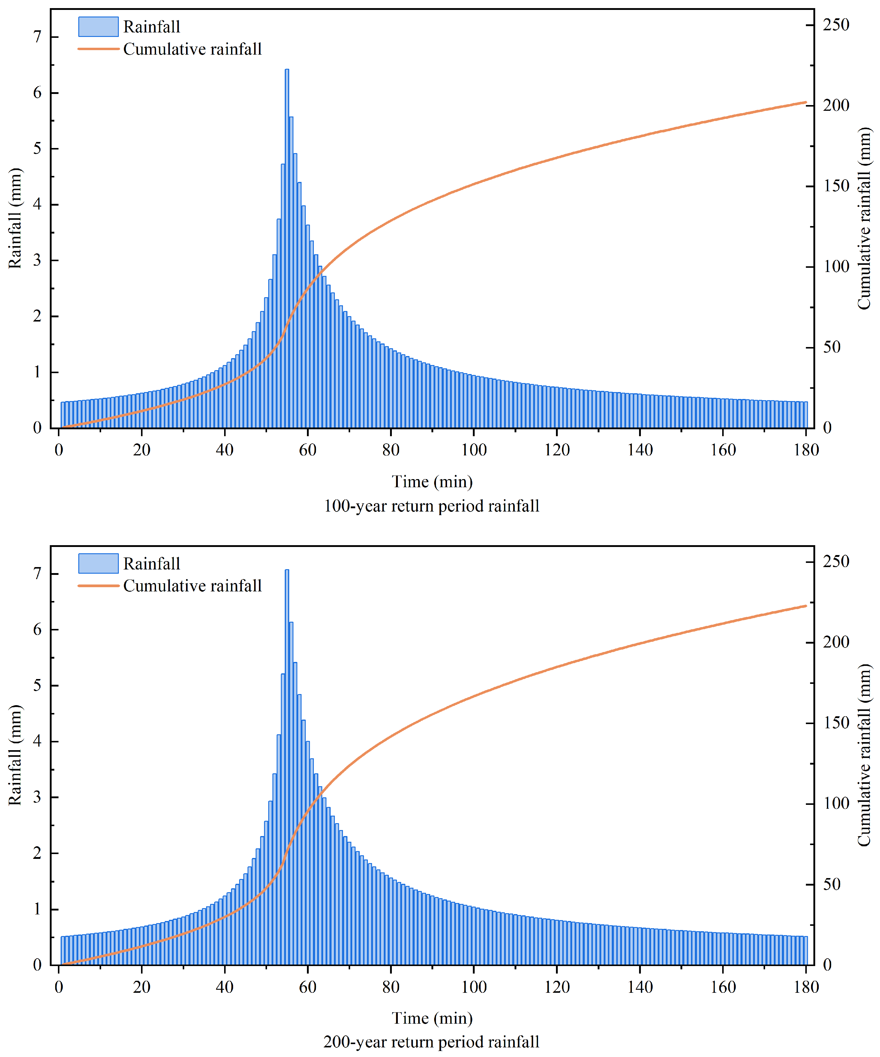 Precipitation is the core hydrological factor driving the runoff generation and convergence processes within a watershed, and it is also a key condition for conducting community flood simulations using hydrodynamic models. The intensity and duration of rainfall directly influence the volume of surface runoff generated within a community, its convergence paths, and convergence velocity, ultimately determining simulation results such as the depth and extent of water accumulation within the study area. To simulate community flooding under varying rainfall intensities, this study employs the Chicago rainfall pattern for designing short-duration heavy rainfall events. The Chicago rainfall pattern method is a non-uniform design rainfall approach that derives the precipitation time series for a given duration and return period, based on the rainstorm intensity formula and the rain peak position coefficient. The key parameters of this method are determined using the local rainstorm intensity formula issued by the meteorological authority, in accordance with the geographic location of the study area. These parameters have been scientifically calibrated by the local meteorological department via the annual maximum value method, using decades of observed historical rainfall data, thus guaranteeing their accuracy and reliability. The rainfall intensity formula is
