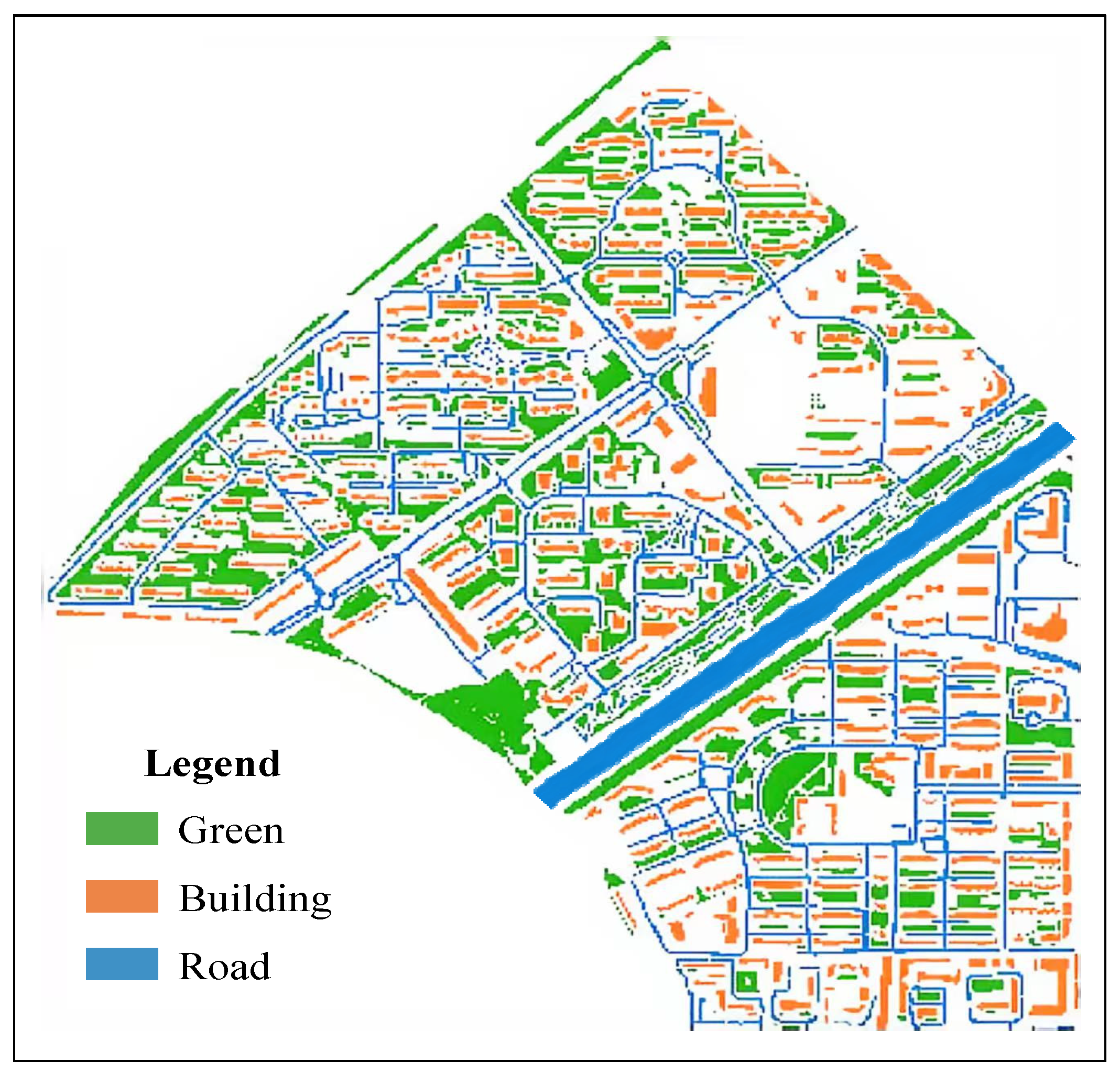 After calculation, the consistency ratio (CR) of the judgment matrices at all levels was found to be less than 0.1. The initial weight of buildings is 0.8855, and the initial weight of green spaces is 0.1145. For the convenience of calculation, this study made reasonable fine-tunings to the weights, ultimately determining the functional weight of buildings as Wb = 0.85 and the functional weight of green spaces as Wg = 0.15.