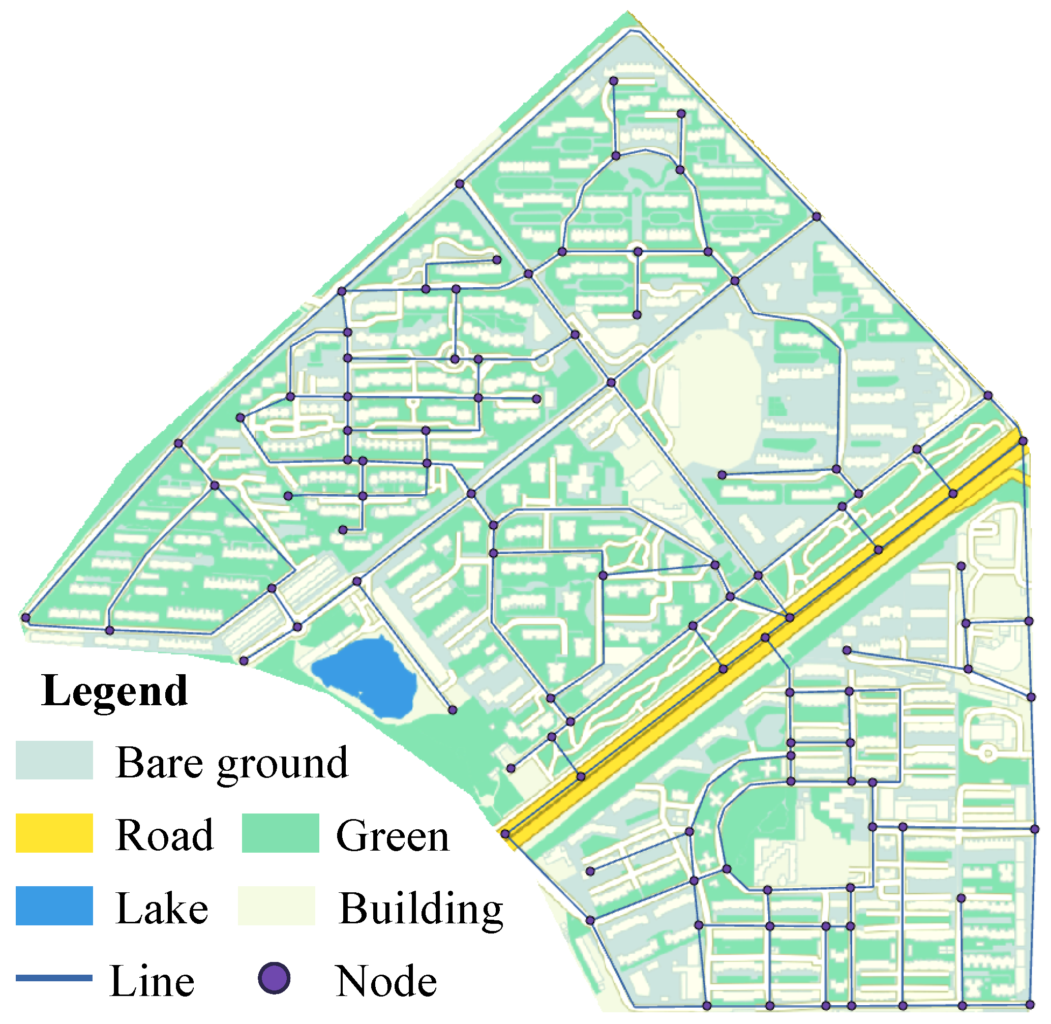 To achieve precise spatial correspondence between hydrodynamic model simulation results and actual community road segments, this study employs the Space L method to construct a road traffic network topology model. As shown in