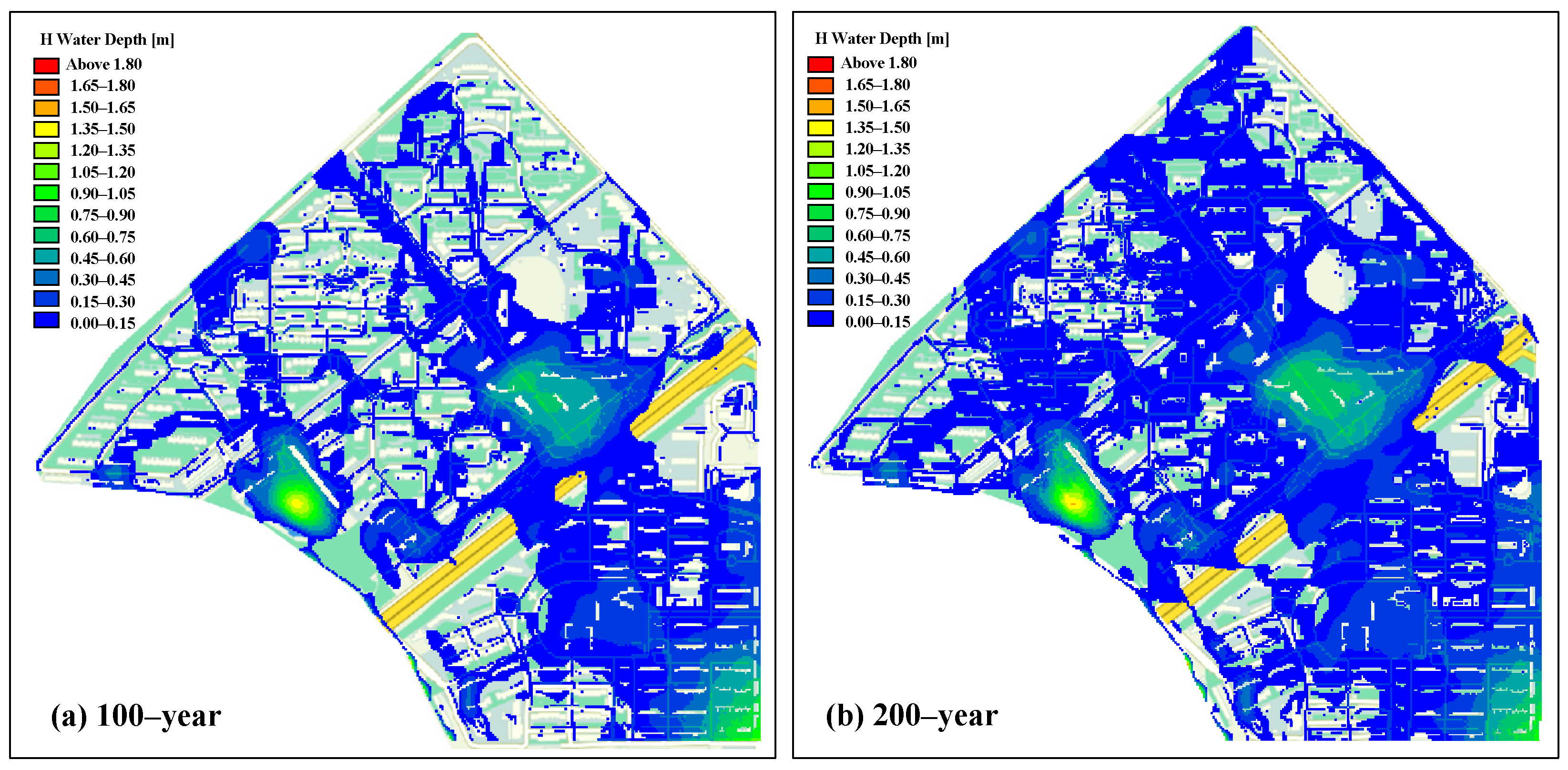 Based on the constructed hydrodynamic model, this study simulated community flooding under two extreme rainfall scenarios: a 100-year event and a 200-year event. The most severe flooding conditions are depicted in the simulation results. As shown in
