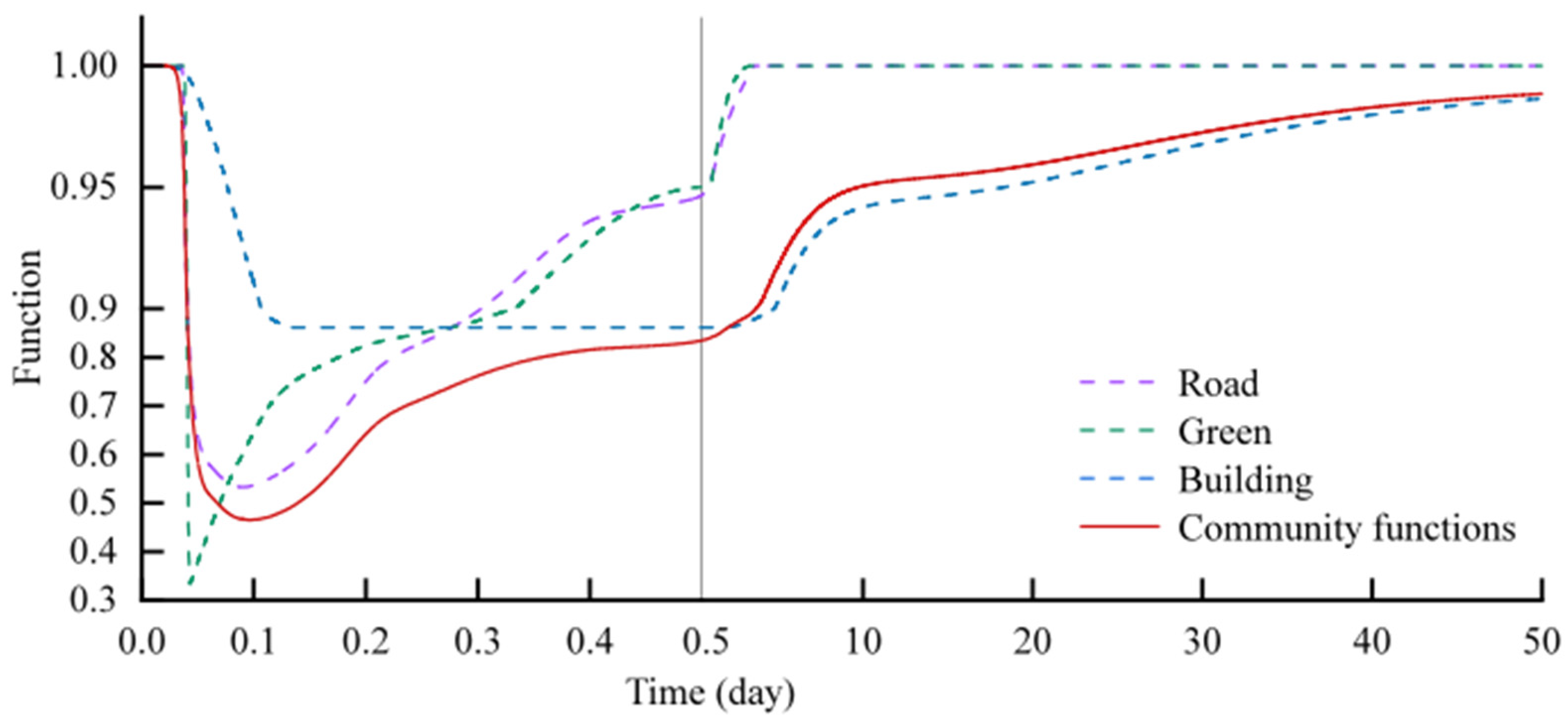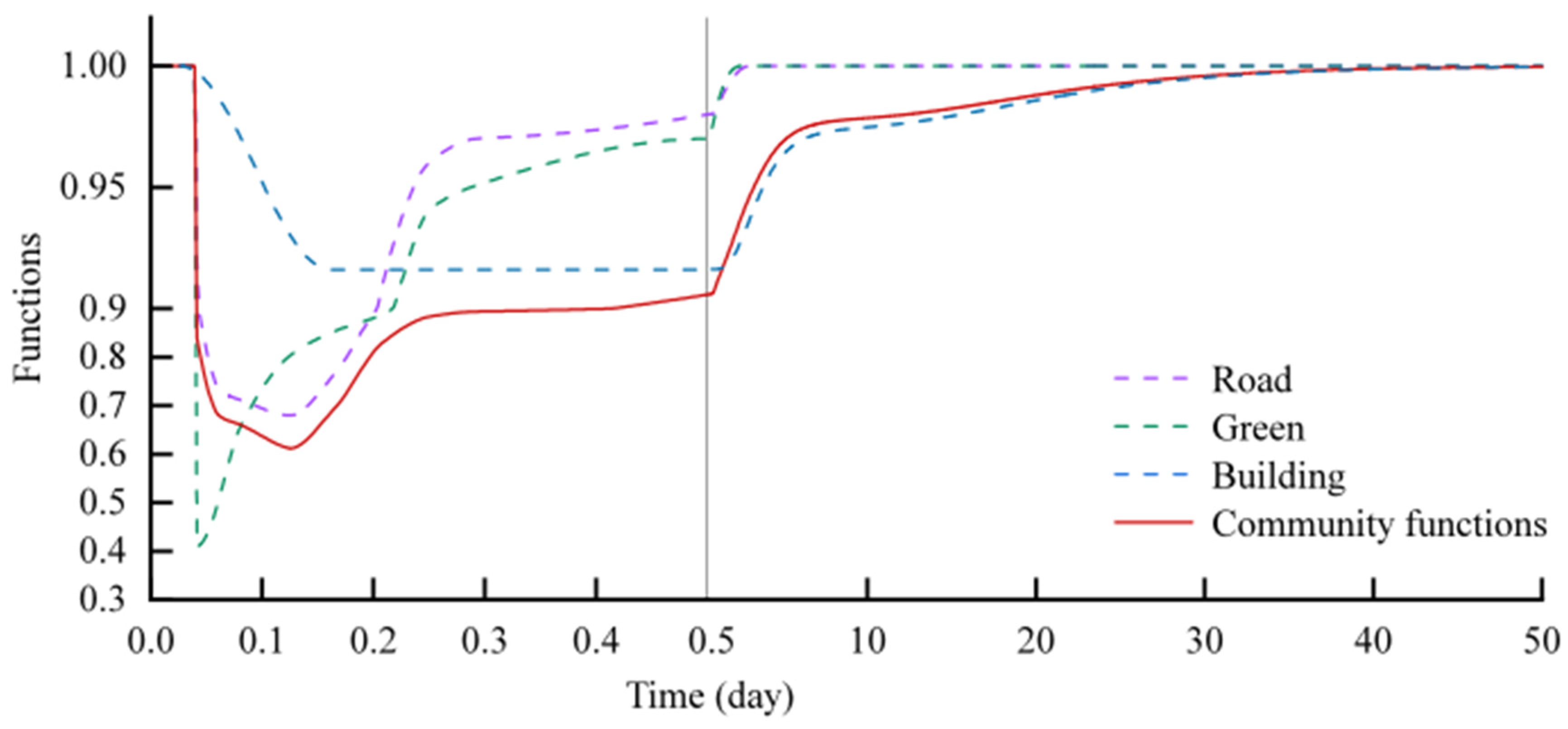 Figure 12, the functional curves of the road, green space, and building subsystems exhibited distinct patterns throughout the entire simulation period, which can be analyzed in two key phases. Period of community functional decline (0–3 h): The green space functionality dropped sharply to the minimum value of 0.42 at approximately 1 h after the start of rainfall, while the road functionality fell to the minimum value of about 0.68 at around 3 h. During t = 0–2 h, the building functionality remained stable at 1.0; starting from t = 2 h, with the continuous rise in outdoor waterlogging depth, the building functionality began to deteriorate and reached the minimum value of about 0.92 at approximately t = 3 h. The overall community functionality index, indicated by the red solid line in the figure, decreased to the minimum value of 0.52 at around t = 3 h. Period of community functional recovery (3 h–50 d): The recovery curves of green spaces and roads exhibited extremely high recovery efficiency, rebounding rapidly to near the initial level within a few hours after the disaster. In contrast, the functional recovery of the building system was considerably slow and had not fully converged to 1.0 even at t = 40 d. The overall community functionality curve showed a two-stage recovery pattern: it synchronized with the rapid recovery of roads and green spaces in the early recovery stage, placing the community functionality in a phase of fast recovery. At approximately 10 d, the upward trend of the community functionality curve weakened and became consistent with that of the building system, which had the slowest recovery rate.
