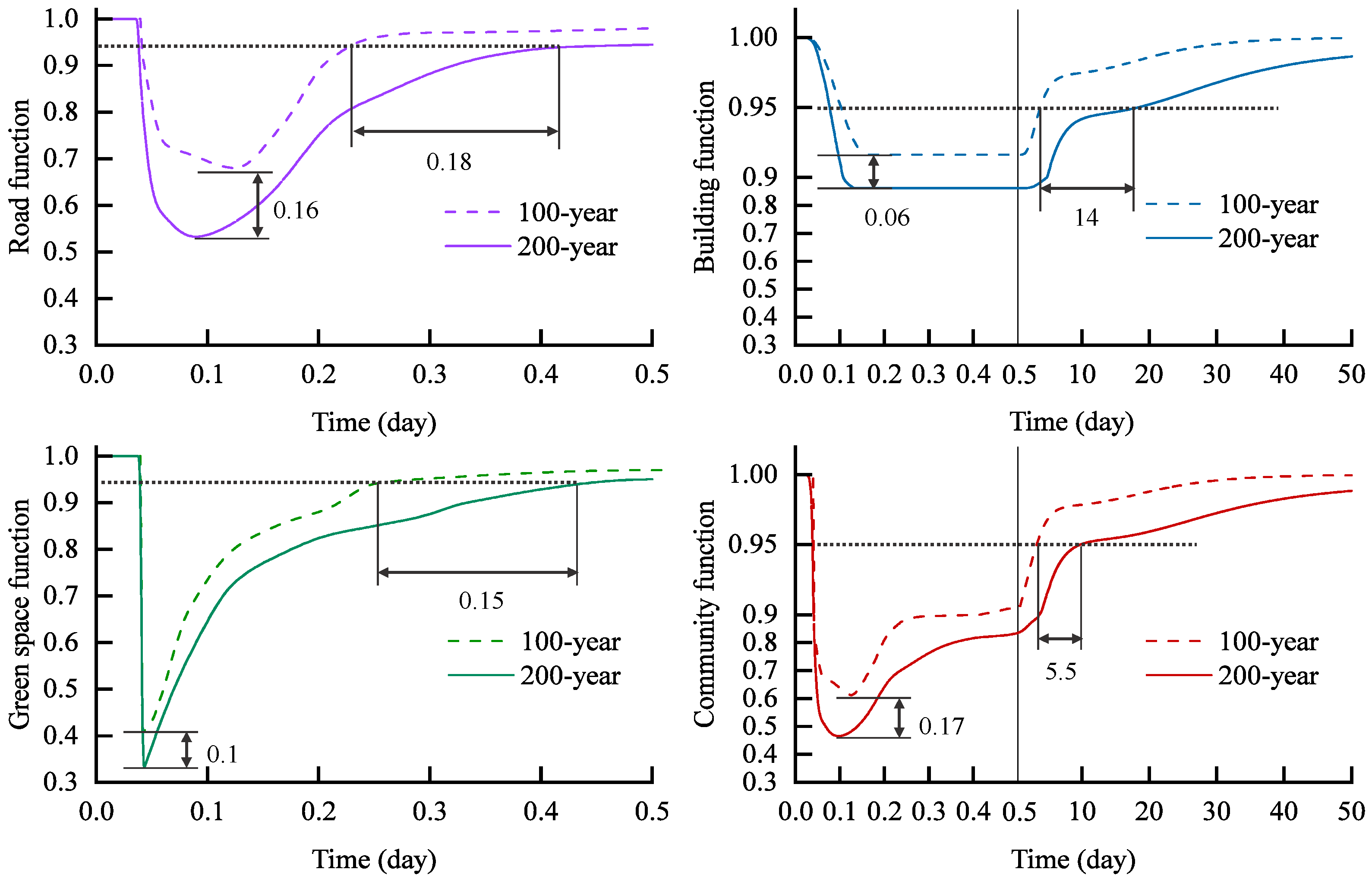 Figure 13). Compared with the 100-year scenario, the extent of damage to roads, green spaces, and buildings is more severe, and the time required for their recovery is significantly longer, exhibiting distinct differences in the recovery process (