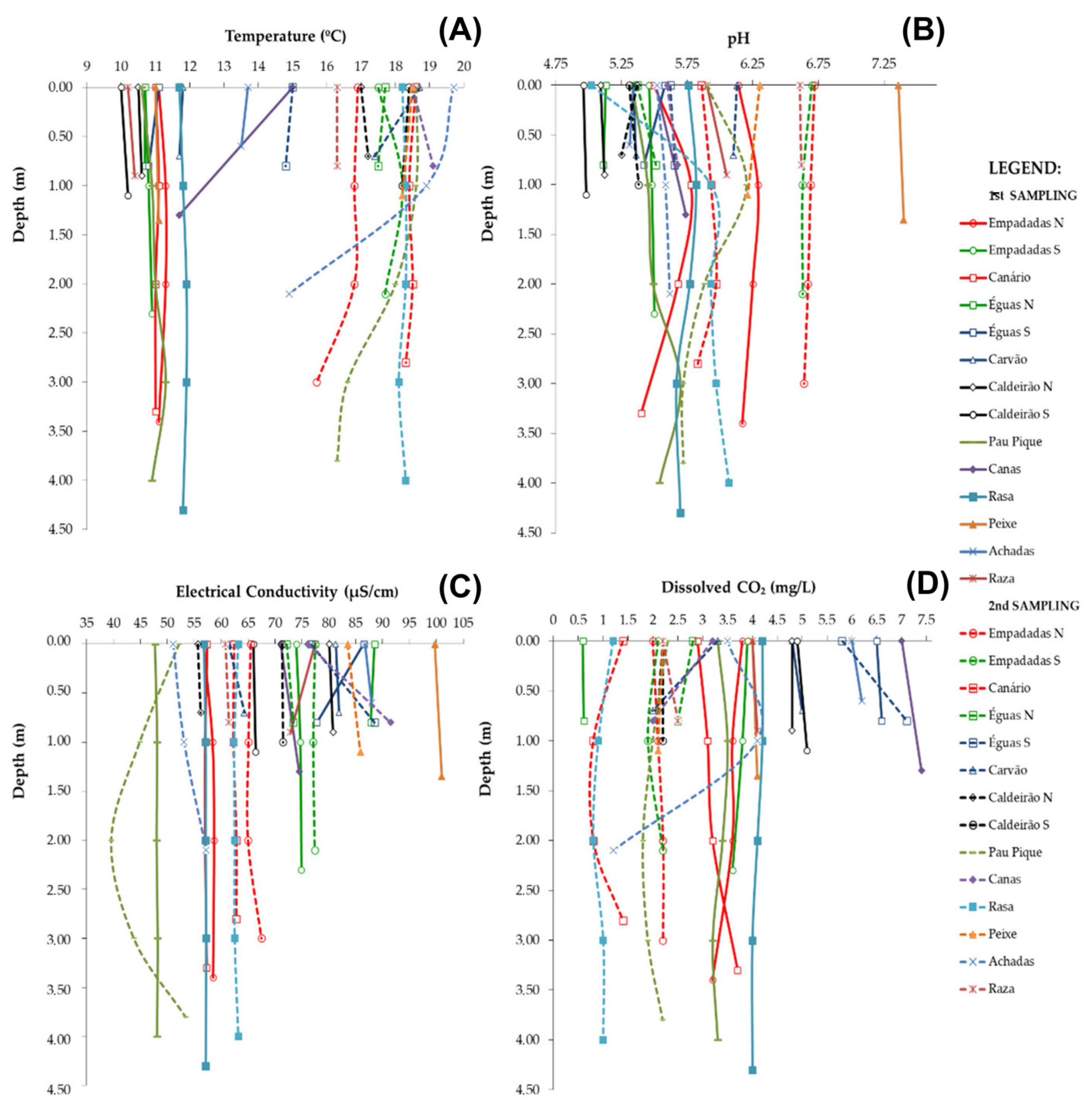 4.1. Main Physico-Chemical Parameters Variation with Depth