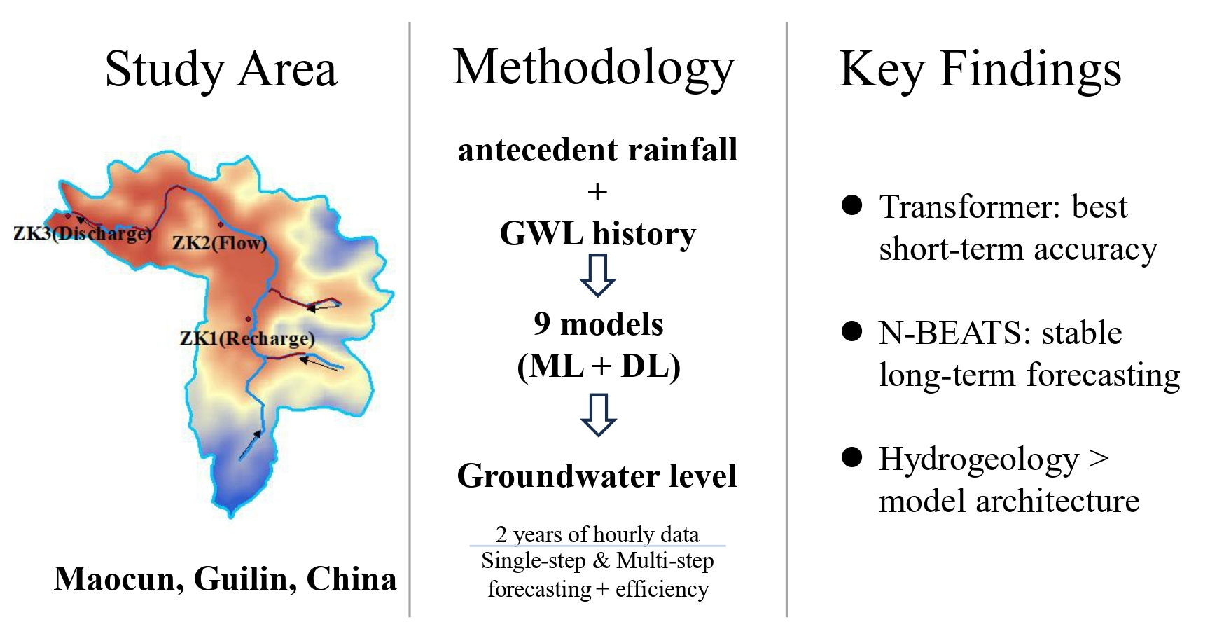 To address the above challenges, this study systematically evaluates nine ML and DL models (RF, XGBoost, LSTM, CNN, Transformer, N-BEATS, CNN-LSTM, Seq2Seq-LSTM, and Attention-Seq2Seq-LSTM) for rainfall–groundwater level forecasting in a typical karst watershed in Guilin, Guangxi. Three monitoring sites representing distinct hydrogeological zones, namely the recharge, flow, and discharge zones, were selected, and two years of hourly high-frequency data were employed. The central scientific question addressed in this study is to what extent hydrogeological complexity, relative to model architecture, governs prediction feasibility in karst groundwater systems. To investigate this question, three specific objectives are pursued: (1) to quantify the relative influence of hydrogeological conditions versus model architecture on prediction performance by systematically comparing nine models across three sites with contrasting hydrogeological characteristics; (2) to evaluate single-step and multi-step prediction performance and characterise stability degradation trends across increasing forecast horizons; (3) to assess the trade-off between prediction accuracy and computational efficiency and identify model structures best suited to karst groundwater forecasting under different application scenarios. The scientific contributions of this work are threefold. First, we provide systematic cross-site evidence that hydrogeological complexity constitutes a dominant constraint on model predictive skill, consistently outweighing architectural differences across all nine model families, a finding that reframes model selection in karst systems as a hydrogeological problem rather than purely an algorithmic one. Second, we propose a replicable multidimensional evaluation framework integrating single-step accuracy, multi-step stability, and computational efficiency, which can serve as a methodological reference for model selection and performance assessment in complex hydrological systems. Third, we present the first application of N-BEATS to karst groundwater level forecasting, expanding the methodological toolkit available for heterogeneous aquifer environments.