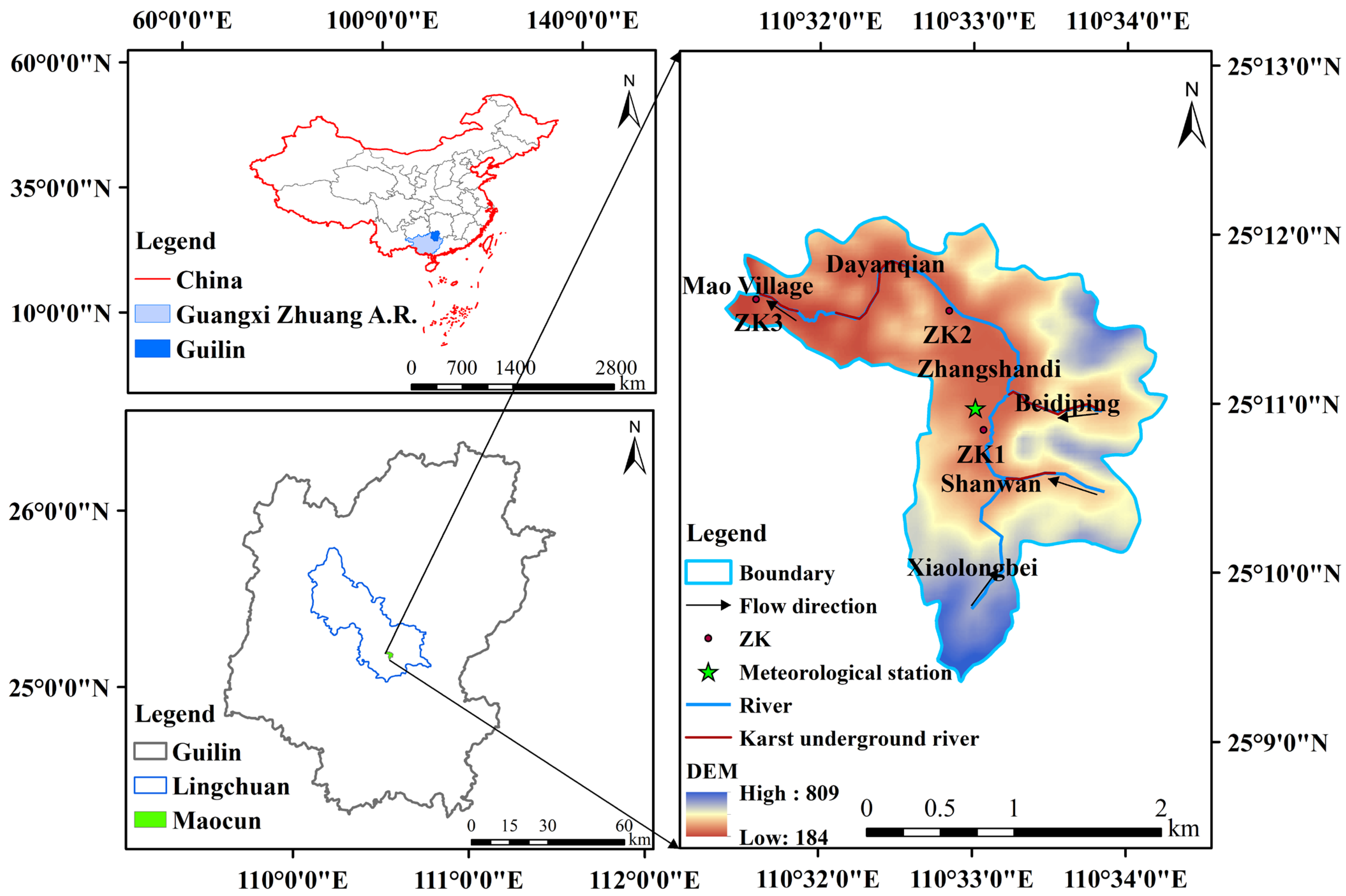 The Maocun subterranean river catchment is situated in the southeastern part of Chaotian Township, Lingchuan County, Guilin City, Guangxi Zhuang Autonomous Region (110°30′–110°35′ E, 25°09′–25°13′ N), encompassing an area of approximately 11.2 km